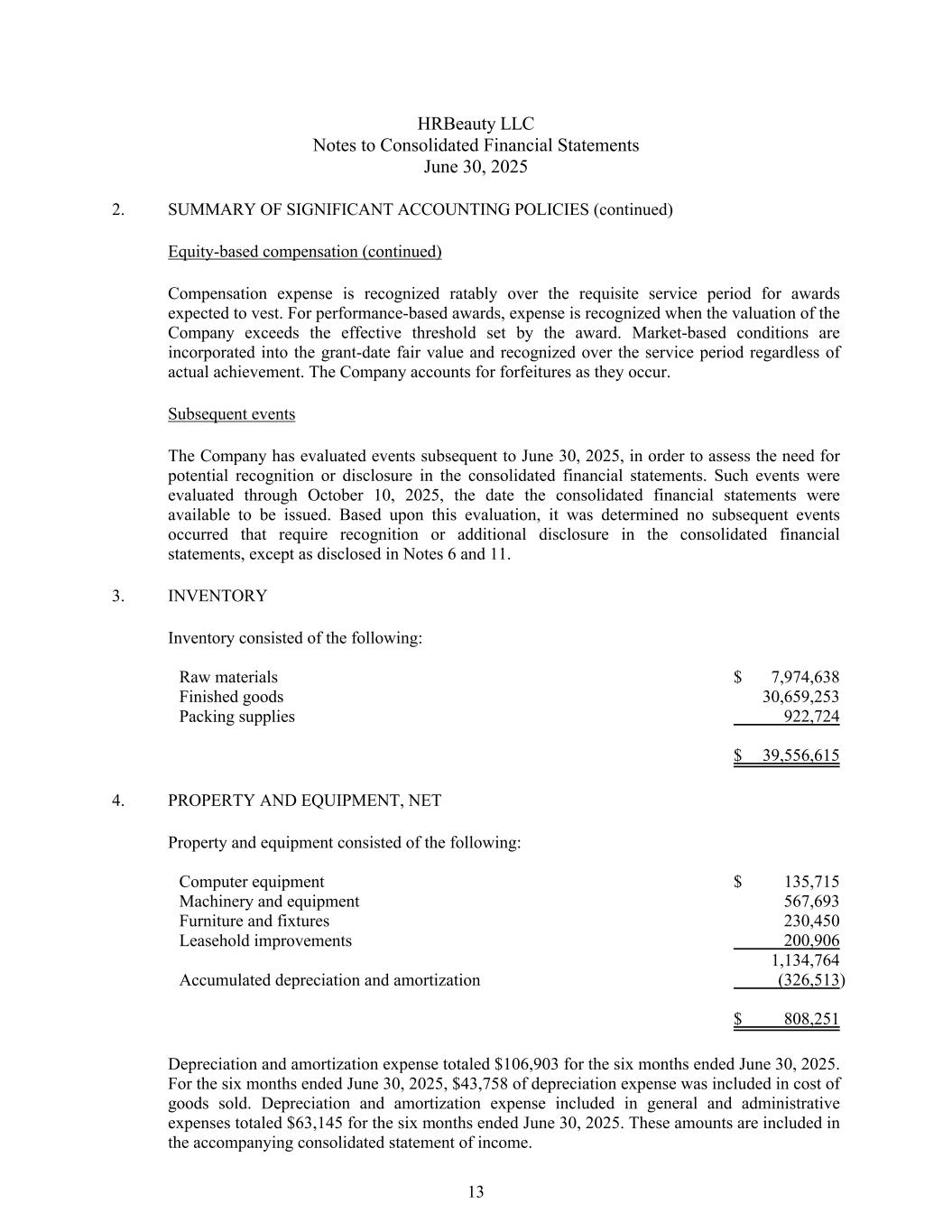 HRBeauty LLC合并财务报表附注2025年6月30日2。重要会计政策概要(续)股权补偿(续)补偿费用在预期归属的奖励的必要服务期内按比例确认。对于基于绩效的奖励,当公司估值超过奖励规定的有效阈值时确认费用。基于市场的条件纳入授予日公允价值,并在服务期内确认,无论实际实现情况如何。公司对发生的没收进行会计处理。后续事件公司已评估2025年6月30日之后的事件,以评估在合并财务报表中潜在确认或披露的必要性。此类事件的评估截止至2025年10月10日,即可获得发布合并财务报表之日。根据这一评估,确定除附注6和11披露的情况外,没有发生需要在综合财务报表中确认或额外披露的后续事件。3.库存库存包括:原材料7,974,638美元成品30,659,253包装用品922,724美元39,556,6154美元。财产和设备、净财产和设备包括:计算机设备135,715美元机械和设备567,693家具和固定装置230,450租赁改进200,9061,134,764累计折旧和摊销(326,513)808,251美元截至2025年6月30日止六个月的折旧和摊销费用总计106,903美元。截至2025年6月30日止六个月,43,758美元的折旧费用计入销售成本。截至2025年6月30日的六个月,包括在一般和管理费用中的折旧和摊销费用总计63,145美元。这些金额包含在随附的综合损益表中。13
