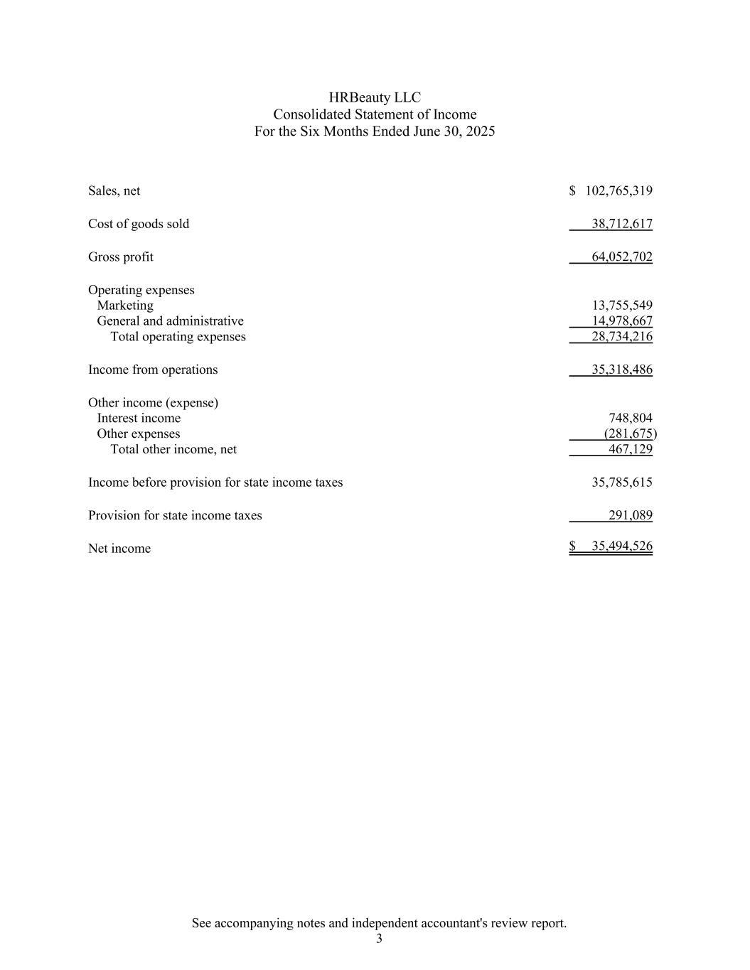 HRBeauty LLC截至2025年6月30日止六个月的综合损益表销售额净额102,765,319美元销售成本38,712,617毛利润64,052,702营业费用营销13,755,549一般和行政费用14,978,667营业费用总额28,734,216营业收入35,318,486其他收入(费用)利息收入748,804其他费用(281,675)其他收入总额,净额467,129州所得税拨备前收入35,785,615州所得税拨备291,089美元净收入35,494,526见附注和独立会计师审阅报告。3
