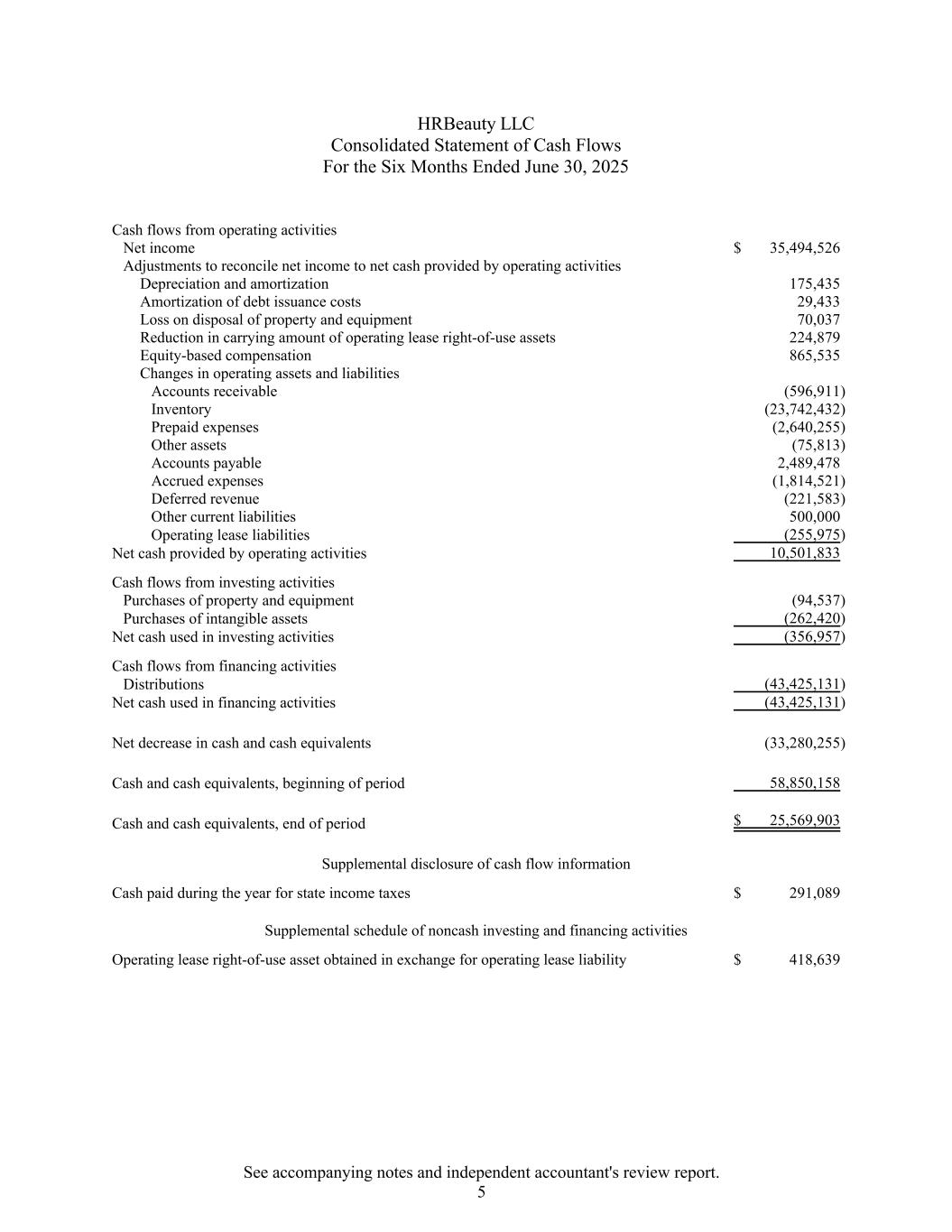 HRBeauty LLC截至6月30日止六个月综合现金流量表,2025年经营活动产生的现金流净收入35,494,526美元调整净收入与经营活动提供的净现金折旧和摊销175,435债务发行费用摊销29,433财产和设备处置损失70,037经营租赁使用权资产账面金额减少224,879股权补偿865,535经营资产变动应收账款(596,911)存货(23,742,432)预付费用(2,640,255)其他资产(75,813)应付账款2,489,478应计费用(1,814,521)递延收入(221,583)其他流动负债500,000经营租赁负债(255,975)经营活动提供的现金净额10,501,833投资活动现金流量购置物业及设备(94,537)购买无形资产(262,420)投资活动现金流量净额(356,957)筹资活动现金流量分配款(43,425,131)筹资活动现金及现金等价物净减少额(33,280,255)现金及现金等价物,期初58,850,158现金及现金等价物,期末25,569,903美元补充披露现金流信息年内为州所得税支付的现金291,089美元非现金投资和融资活动的补充时间表以经营租赁负债换取的经营租赁使用权资产418,639美元见附注和独立会计师的审查报告。5