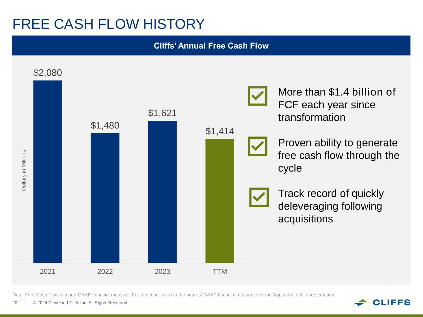 © 2024 Cleveland-Cliffs Inc.保留所有权利。20 Cliffs的年度自由现金流自由现金流历史自转型以来每年有超过14亿美元的FCF证明了通过收购后迅速去杠杆化的周期记录产生自由现金流的能力注:自由现金流是一种非公认会计准则财务指标。有关与最接近的GAAP财务指标的对账,请参阅本演示文稿的附录$ 2,080 $ 1,480 $ 1,621 $ 1,414202120222023 TTM d o lla rs i n m ill io n s