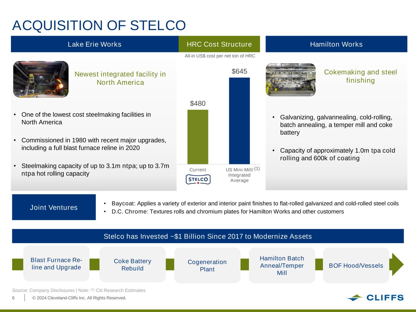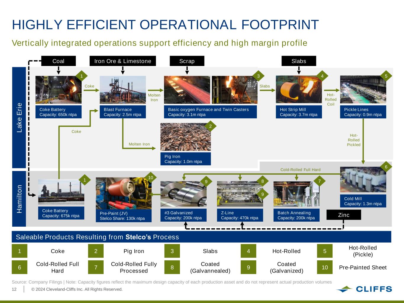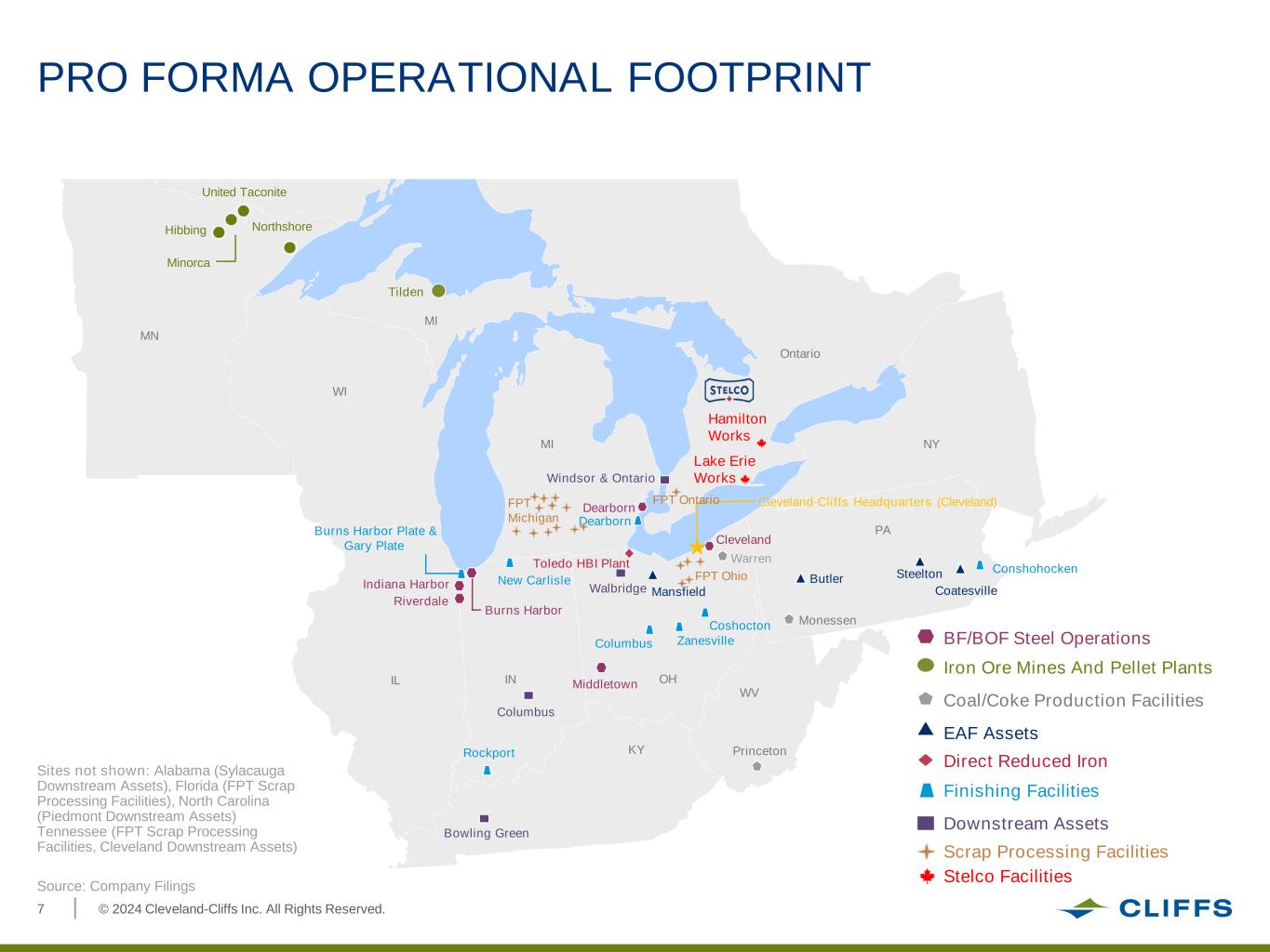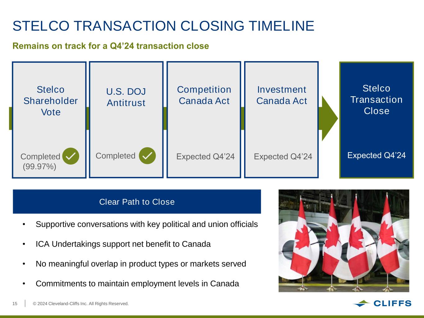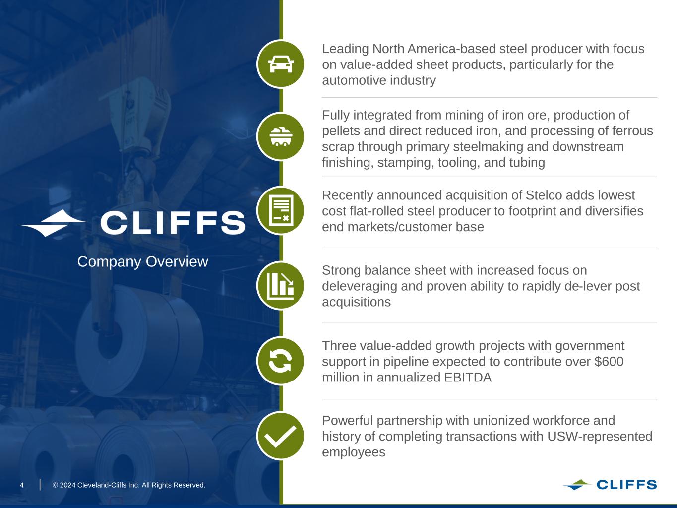 © 2024 Cleveland-Cliffs Inc.保留所有权利。3本演示文稿包含的陈述构成联邦证券法含义内的“前瞻性陈述”。除历史事实以外的所有陈述,包括但不限于关于我们当前对我们行业或业务的预期、估计和预测的陈述,均为前瞻性陈述。我们提醒投资者,任何前瞻性陈述都存在风险和不确定性,可能导致实际结果和未来趋势与此类前瞻性陈述中表达或暗示的事项存在重大差异。告诫投资者不要过分依赖前瞻性陈述。可能导致实际结果与前瞻性陈述中描述的结果不同的风险和不确定性包括:钢铁、铁矿石和废金属市场价格持续波动,直接和间接影响我们向客户销售的产品价格;与高度竞争和周期性的钢铁行业相关的不确定性以及我们对汽车行业对钢铁需求的依赖;全球经济状况的潜在弱点和不确定性、全球炼钢产能过剩、铁矿石供过于求、钢铁进口盛行和市场需求减少;严重的财务困难、破产,我们的一个或多个主要客户、主要供应商或承包商的临时或永久停工或运营挑战,除其他不利影响外,可能会扰乱我们的运营或导致对我们产品的需求减少、增加应收账款的收取难度,以及客户和/或供应商以不可抗力或其他原因声称不履行其对我们的合同义务;与美国政府在1962年《贸易扩展法》(经1974年《贸易法》修订)第232条、《美国-墨西哥-加拿大协定》和/或其他贸易协定、关税、条约或政策方面的行为相关的风险,以及获得和维持有效的反倾销和反补贴税令以抵消不公平贸易进口的有害影响的不确定性;现有和不断增加的政府监管的影响,包括与气候变化和碳排放有关的潜在环境法规,以及相关成本和责任,包括未能收到或维持任何政府或监管当局或来自任何政府或监管当局的所需运营和环境许可、批准、修改或其他授权,以及与实施改进相关的成本,以确保遵守监管变化,包括潜在的财务保证要求,以及回收和补救义务;我们的运营对环境的潜在影响或接触有害物质;我们维持充足流动性的能力、我们的负债水平和资本的可用性可能会限制我们为营运资金、计划资本支出、收购和其他一般公司用途或我们业务的持续需求提供资金所必需的财务灵活性和现金流,或回购我们的普通股;我们在目前预期的时间范围内或根本没有减少债务或向股东返还资本的能力;信用评级、利率、外币汇率和税法;与商业和商业纠纷、反垄断索赔、环境事项、政府调查、职业或人身伤害索赔、财产相关事项、劳动和就业事项或涉及遗留经营和其他事项的诉讼、索赔、仲裁或政府程序有关的诉讼、索赔、仲裁或政府程序的结果和相关费用;能源的成本、质量或可用性的供应链中断或变化,包括电力、天然气和柴油燃料、关键原材料和供应品,包括铁矿石、工业气体、石墨电极、废金属、铬、锌、其他合金、焦炭和冶金煤,以及关键制造设备和备件;与向我们的客户运输产品、在我们的设施之间内部移动制造投入或产品或供应商向我们运输原材料相关的问题或中断;实施战略或持续性资本项目的成本或时间可能被证明比最初预期的更大的风险;我们完成任何公共或私人收购交易以及实现任何或所有预期收益或估计的未来协同效应的能力,以及成功地将任何收购的业务整合到我们现有的业务中;与自然或人为灾害相关的不确定性、不利的天气条件、意外的地质条件、关键设备故障、传染病爆发, 尾矿坝故障和其他意外事件;与由我们或托管或有权访问我们的数据或系统的第三方管理的信息技术系统有关、中断或故障的网络安全事件,包括敏感或重要的业务或个人信息丢失、被盗或损坏以及无法访问或控制系统;与临时或无限期闲置或永久关闭运营设施或矿山的任何业务决策相关的责任和成本,这可能会对相关资产的账面价值产生不利影响,并产生减值费用或关闭和复垦义务,以及与重启任何先前闲置的运营设施或矿山相关的不确定性;我们的自保水平以及我们获得足够第三方保险以充分覆盖潜在不利事件和业务风险的能力;与我们满足客户和供应商的脱碳目标以及根据我们自己宣布的目标减少我们的温室气体排放的能力相关的不确定性;维持我们与利益相关者合作运营的社会许可面临挑战,包括我们的运营对当地社区的影响、在产生温室气体排放的碳密集型行业运营对声誉的影响,以及我们培养一致的运营和安全记录的能力;我们的实际经济矿产储量或当前矿产储量估计的减少,以及任何所有权缺陷或任何租约、许可证的丢失,任何采矿财产的地役权或其他占有式权益;我们与工会和雇员保持令人满意的劳动关系的能力;因计划资产价值变化或无资金债务所需的缴款增加而导致的与养老金和其他离职后福利义务相关的意外或更高成本;填补关键运营职位的技术工人的不确定可用性或成本以及由经验丰富的员工减员或其他原因造成的潜在劳动力短缺,以及我们吸引、雇用、培养和留住关键人员;回购我们普通股的数量和时间;我们对财务报告的内部控制存在潜在的重大缺陷或重大缺陷;与Stelco的拟议交易可能无法完成的风险;与Stelco的交易对Cliffs每股收益的增值可能低于预期,或可能稀释的风险,可能对Cliffs普通股的市场价格产生负面影响;因拟议交易的公告或完成而可能对业务或监管关系产生不利反应或变化的风险;可能导致Cliffs或Stelco一方或双方有权终止两家公司之间的交易协议的任何