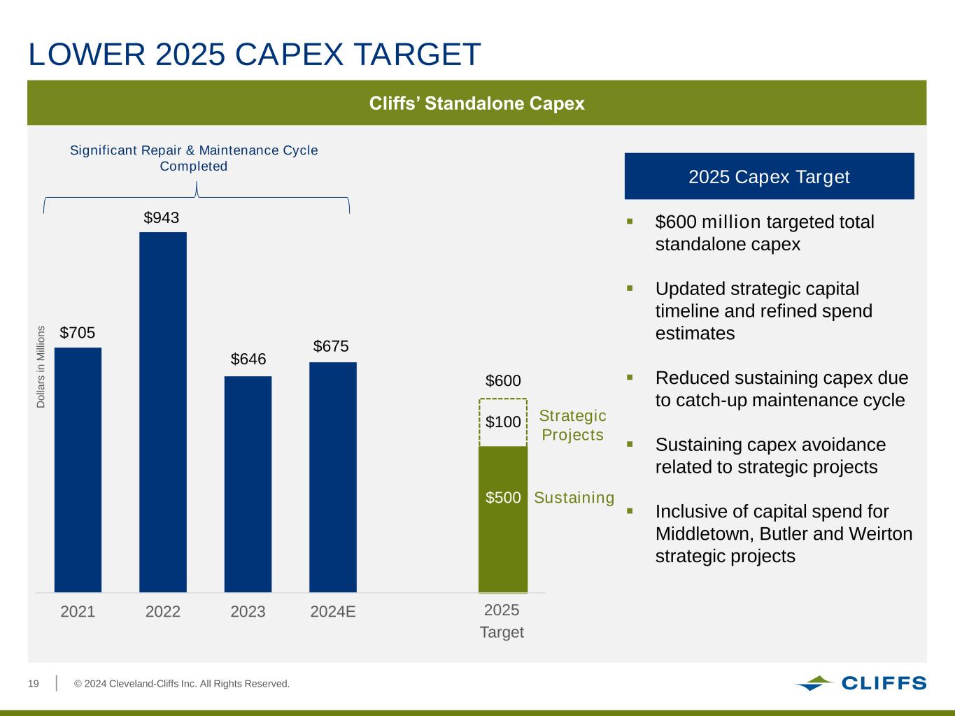 © 2024 Cleveland-Cliffs Inc.TERM0保留所有权利。18资产负债表收购后的实力执行战略、运营和财务机会的灵活性PF利用流动性35亿美元2.8倍注:所有指标均基于Stelco收购后的备考公司。基于LTM 6/30/24 Adj. EBITDA的杠杆率。685美元54320242025202620272028备考5年期债务到期无近期到期且跑道清晰,直至2027年ABL Facility in M ill io n s担保产能超过30亿美元