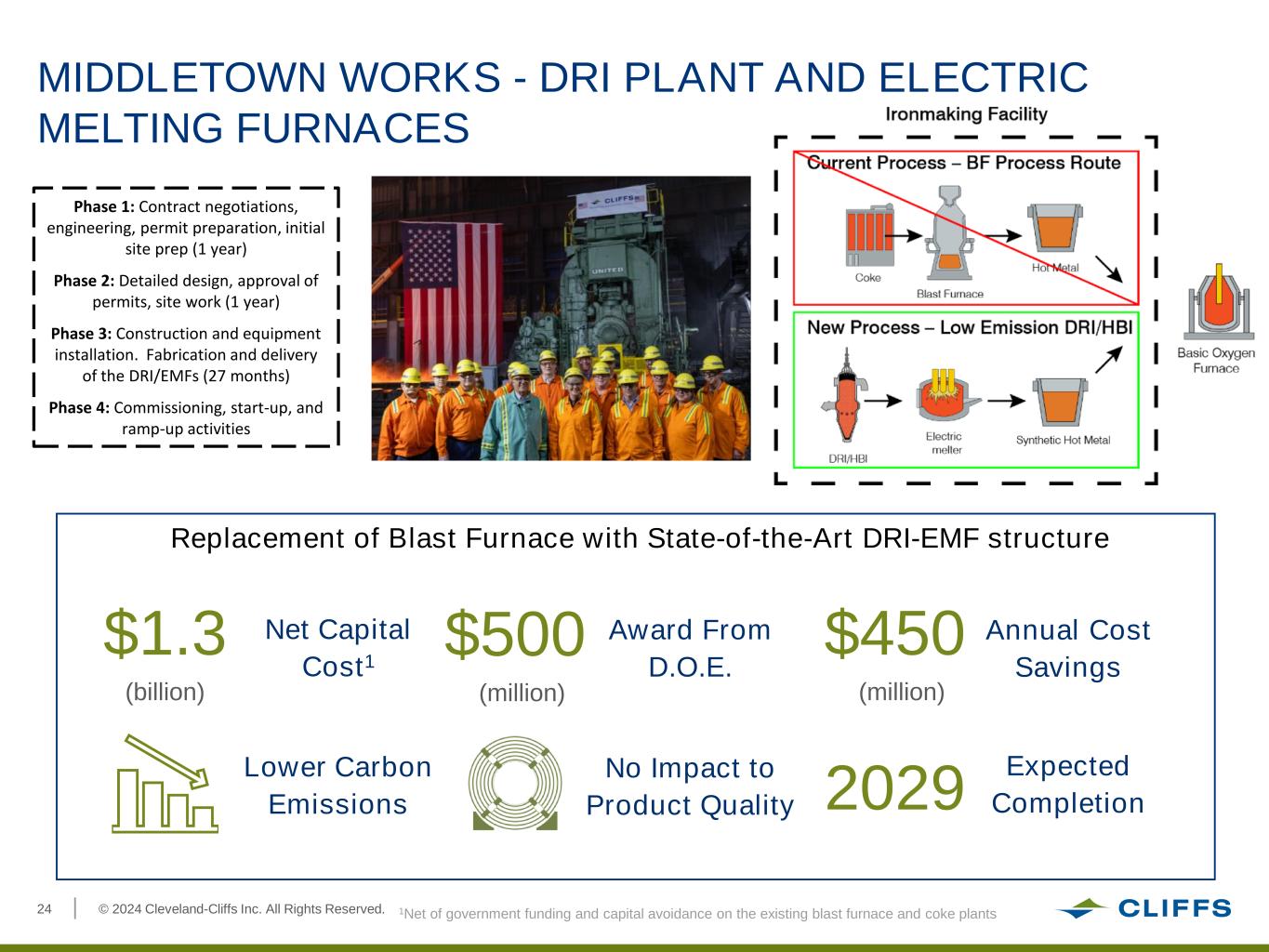 © 2024 Cleveland-Cliffs Inc.TERM0保留所有权利。24 MIDDLETOWN WORKS-DRI工厂和电气熔融提供低碳排放对产品质量无影响净资本成本1奖来自D.O.E.年度成本节约$ 13(billion)$ 5(million)$ 450(million)预期完成2029用最先进的DRI-EMF结构更换高炉1net政府资助和资本规避现有高炉和焦炭厂第1阶段:合同谈判、工程、许可证准备、初步现场准备(1年)第2阶段:详细设计、许可审批、现场工作(1年)第3阶段:施工和设备安装。DRI/EMF的制造和交付(27个月)第4阶段:调试、启动和爬坡活动
