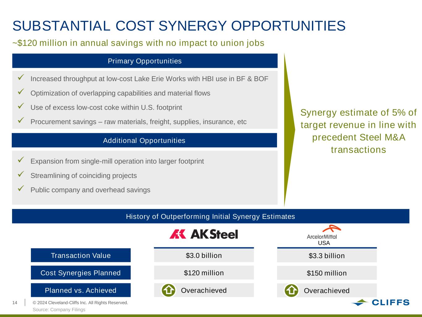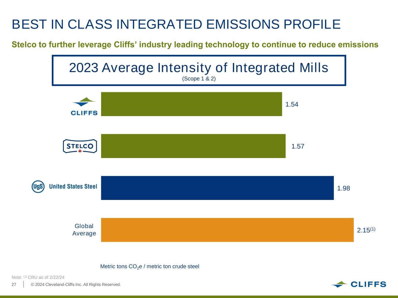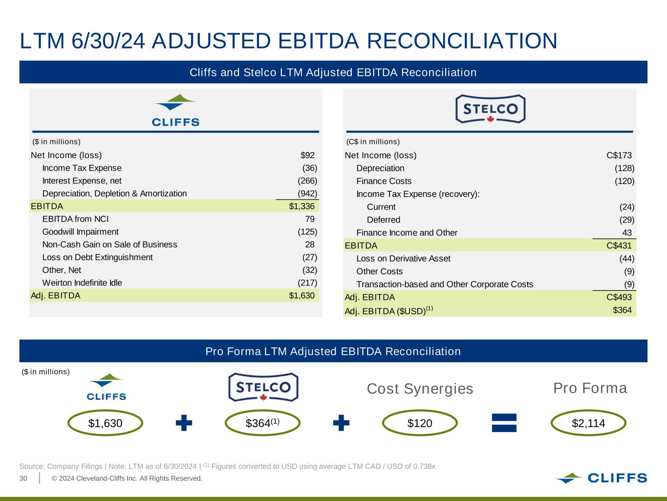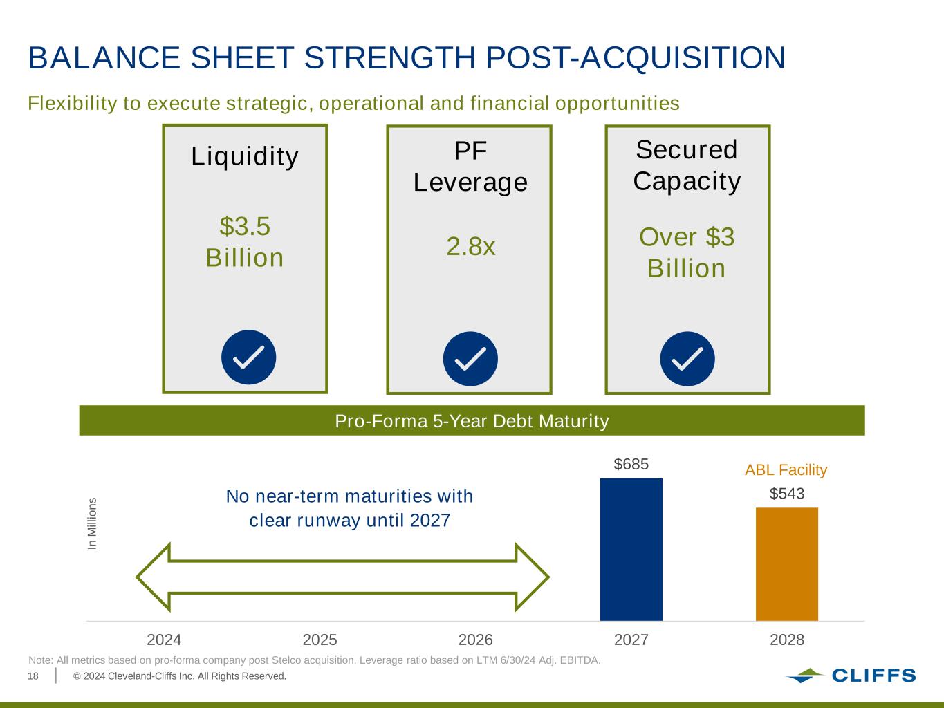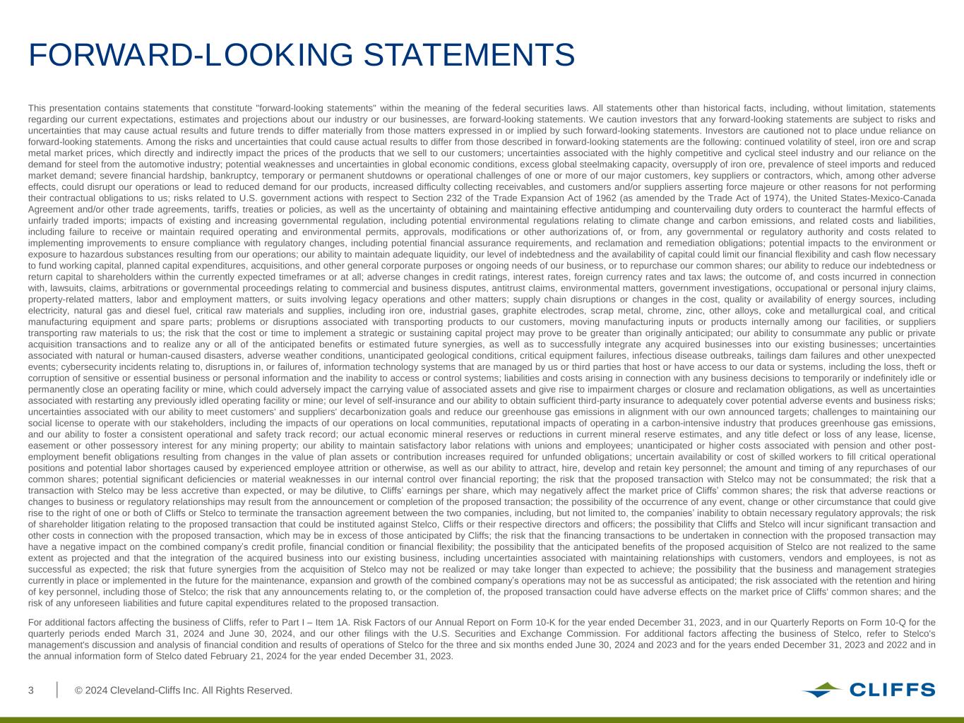© 2024 Cleveland-Cliffs Inc.TERM0保留所有权利。2本演示文稿由Cleveland-Cliffs Inc.(“公司”、“Cliffs”、“克利夫兰克里夫”、“我们”或“我们”)编制,仅供公司向其交付本演示文稿的一方使用。本演示文稿是公司的财产,并包含公司形成的专有机密,仅供您参考,不得为任何目的全部或部分复制、进一步分发给任何其他人或发布。通过参加本次演示,您同意受这些条款的约束。本演示文稿仅供参考,公司不对本演示文稿所载信息的准确性、完整性或可靠性作出任何明示或暗示的陈述或保证。接受本演示文稿进一步构成贵公司承认并同意,公司、公司直接和间接股权持有人及其各自的关联公司、董事、高级职员、雇员、合伙人、成员、控制人、代理人或顾问(i)均不对本文件所载信息的准确性、可靠性、合理性或完整性作出任何明示或暗示的陈述或保证,以及(ii)应对收件人或其代表承担与本文件所载信息或此类信息的任何遗漏有关或由此产生的任何责任或承担任何责任,或在其评估公司或涉及公司的任何潜在交易过程中向任何利害关系方传送的任何其他书面或口头通讯。本文讨论的票据(定义如下)没有也不会根据1933年美国证券法(经修订,“法案”)或任何州证券法或任何外国司法管辖区的法律进行登记。票据仅提供给根据该法案第144A条被合理认为是“合格机构买家”的人,以及根据该法案的S条例向美国境外的非美国人提供。因此,本文件仅提供给被合理认为是该法案第144A条所定义的“合格机构买家”的人,或者是在美国境外的非美国人。通过接受此演示文稿,您将被视为代表您是合格的机构买家或美国境外的非美国人。票据未获得美国证券交易委员会或任何其他证券监管机构或机构的批准或不批准,也未有任何此类授权、委员会或机构通过本演示文稿的准确性或充分性。任何相反的陈述都是刑事犯罪。票据将受到可转让性和转售的限制,不得转让或转售,除非该法案和适用的州证券法根据登记或豁免许可。投资者应注意,他们可能被要求无限期地承担投资于票据的财务风险。票据将不会在任何证券交易所或自动报价系统上市,任何人没有义务为票据做市。在任何信息不一致的情况下,本演示文稿将被此处讨论的票据的发行备忘录所取代,并应与其一并阅读。发售要约及购买票据的要约邀请(如适用)仅由拟提供的初步发售备忘录作出,且此处的信息必须与将提供的初步发售备忘录一并阅读,因为该等发售备忘录可能会进一步补充、修订或由最终发售备忘录(如此补充、修订或取代,“发售备忘录”)取代。此处包含的信息并不旨在是完整的,并受制于相同的资格和假设,投资者应仅根据发售备忘录中披露的相同警告、缺乏保证和陈述以及其他预防事项进行考虑。本演示文稿包括公司的某些非公认会计准则财务指标,包括关于公司的调整后EBITDA和自由现金流,以及Stelco Holdings Inc.(“Stelco”)的某些非国际财务报告准则财务指标,包括调整后EBITDA。公司使用调整后的EBITDA,并认为投资者、贷方和财务报表的其他外部用户使用调整后的EBITDA来评估和比较公司与钢铁行业其他公司的经营业绩。此外, 公司管理层认为,调整后的EBITDA是一种有用的衡量标准,可以在不受资本结构影响的情况下评估业务的盈利能力,并可用于评估我们偿还债务和为业务未来资本支出提供资金的能力。该公司使用自由现金流,并认为这是评估可用于偿还债务、战略举措或其他融资活动的现金产生的重要衡量标准。非GAAP和非IFRS财务指标,如调整后EBITDA和非GAAP财务指标,如自由现金流,应仅被视为对根据GAAP或IFRS编制的财务指标的补充,而不是优于。有关公司的非GAAP财务指标和Stelco的非IFRS指标与根据GAAP或IFRS编制的财务指标的对账(如适用),请参阅本演示文稿的附录。公司明确表示不承担与使用本演示文稿有关或因使用本演示文稿而导致的任何和所有责任。此外,本演示文稿中包含的信息截至本协议发布之日,公司没有义务更新此类信息,包括在此类信息变得不准确的情况下。本演示文稿包含基于行业出版物和报告或其他公开信息的有关我们行业的估计和信息,包括市场地位以及我们参与的市场的规模和增长率。业界调查和出版物一般指出,其中所载信息是从被认为可靠的来源获得的,但无法保证所载信息的准确性和完整性。我们没有独立核实这一第三方信息。法律免责声明这些材料不得印刷、下载或分发。这些材料只提供给QIB和非美国人士