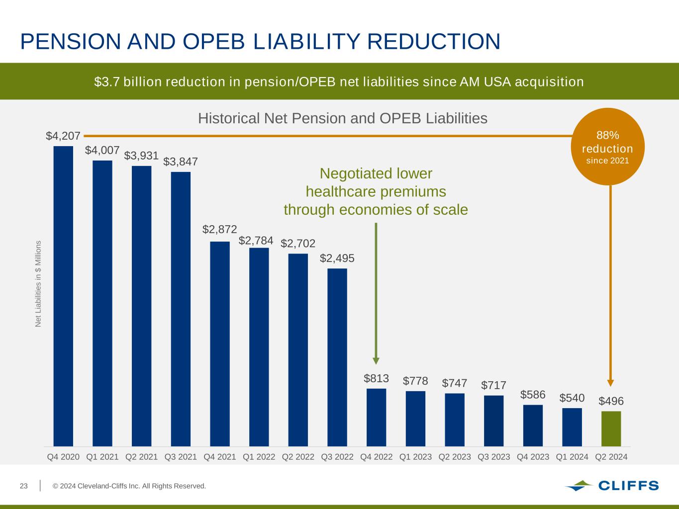 © 2024 Cleveland-Cliffs Inc.TERM0保留所有权利。23 $ 4,207 $ 4,007 $ 3,931 $ 3,847 $ 2,872 $ 2,784 $ 2,702 $ 2,495 $ 813 $ 778 $ 747 $ 717 $ 586 $ 540 $ 496 Q4 2020 Q1 2021 Q2 2021 Q3 2021 Q4 2021 Q1 2022 Q2 2022 Q3 2022 Q4 2022 Q1 2023 Q2 2023 Q3 2023 Q4 2023 Q1 2024 Q2 2024养老金和OPEB负债减少37亿美元自AM USA收购以来养老金/OPEB净负债减少37亿美元自2021年以来减少88%历史净养老金和OPEB负债通过规模经济协商降低医疗保险费