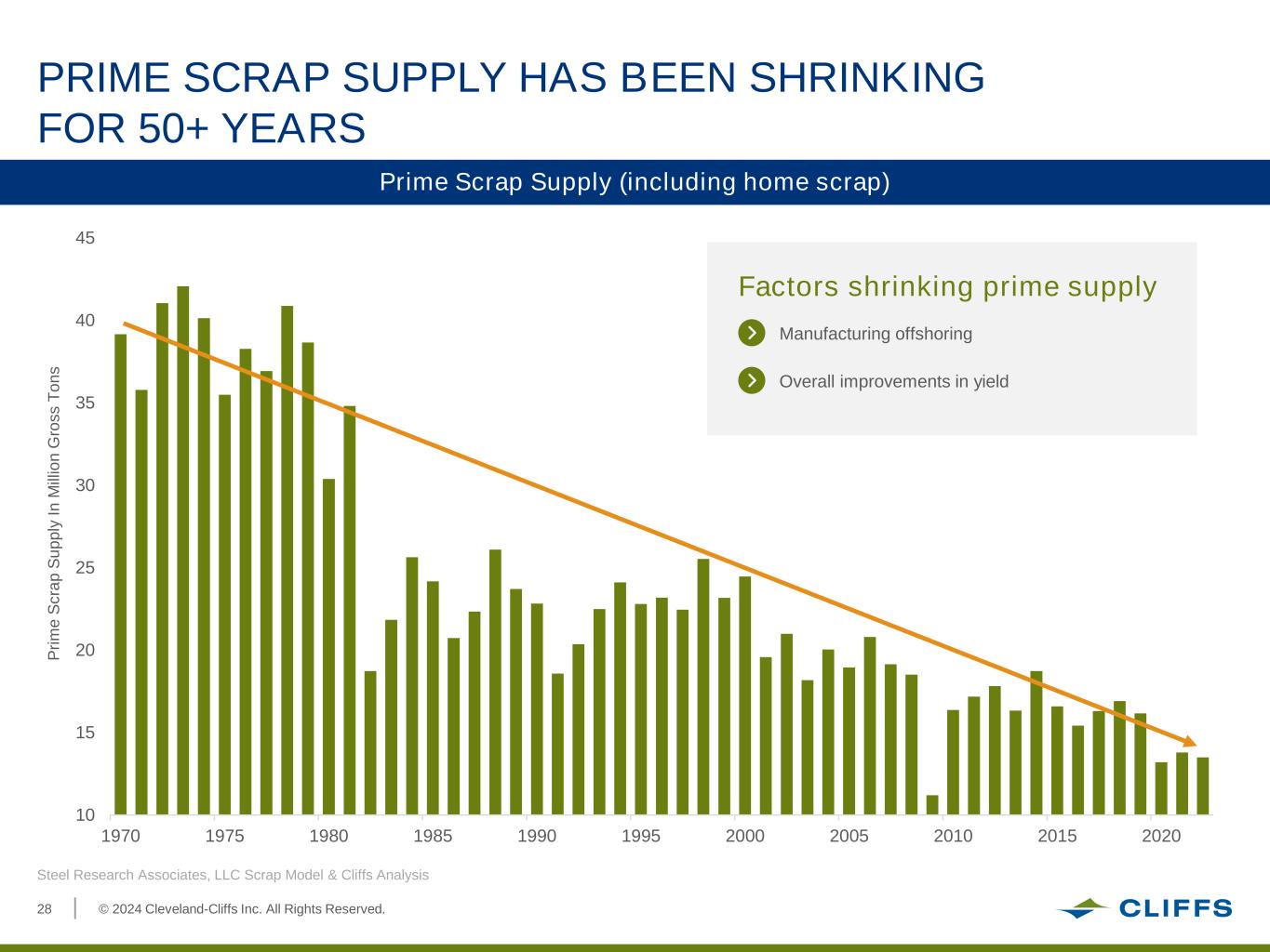 © 2024 Cleveland-Cliffs Inc. All rights reserved.28 10152025303540451970197519801985198519901995200020052005201020152020 Steel Research Associates,LLC Scrap Model & Cliffs Analysis PRIME Scrap Supply has been shrinking for 50 + years Prime Scrap Supply(including home scrap)P ri m e s c ra p p s u p p ly i n m ill io n g ro s t o n s factors shrinking prime supply in yield manufacturing offshoring