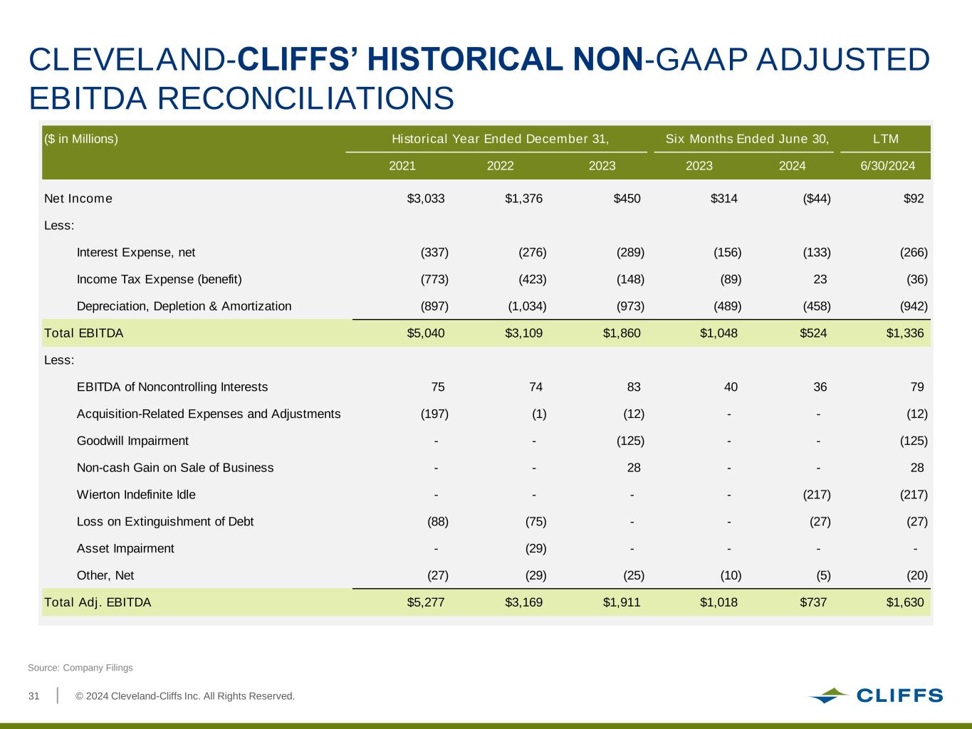 © 2024 Cleveland-Cliffs Inc.TERM0保留所有权利。30来源:公司备案|注:截至2024年6月30日的LTM |(1)使用平均LTM加元/美元0.738x备考LTM 6/30/24调整后EBITDA调节净收入(亏损)173加元折旧(128)财务成本(120)所得税费用(回收):当期(24)递延(29)财务收入和其他43 EBITDA衍生资产损失431加元(44)其他成本(9)基于交易和其他公司成本(9)调整后EBITDA 493加元调整后EBITDA(美元)(1)364美元净收入(亏损)92美元所得税费用(36)利息费用,净额(266消耗和摊销(942)EBITDA 1336美元来自NCI的EBITDA 79商誉减值(125)出售业务的非现金收益28债务清偿损失(27)其他,净额(32)Weirton无限期闲置(217)调整后EBITDA 1630美元Cliffs和Stelco LTM调整后EBITDA调节(百万美元)(百万加元)1630美元备考LTM调整后EBITDA调节364美元(1)2114美元成本协同效应(百万美元)120美元
