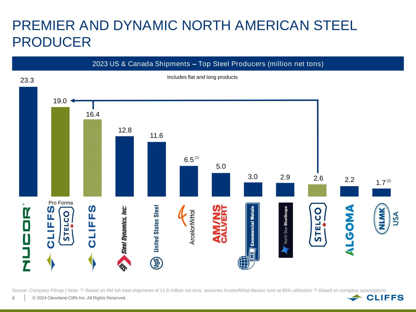 © 2024 Cleveland-Cliffs Inc.TERM0保留所有权利。7 PRO FORMA Operational FOOPRINT Hibbing Toconite矿(拥有85.3%股权)BF/BOF钢铁运营铁矿和球团厂煤炭/焦炭生产设施丨EAF 丨EAF资产直接还原铁精加工设施下游资产废钢加工设施Stelco设施Northshore Minorca United Toconite ConshohockenSteelton Bowling Green MI Tilden Burns Harbor Windsor & Ontario FPT Michigen Toledo 克利夫兰克里夫Ontario Riverdale Indiana Harbor Coatesville Warren WI IL MN Hibbing资料来源:未显示的公司备案网站:阿拉巴马州(Sylacauga下游资产)、佛罗里达州(FPT废钢加工设施)、北卡罗来纳州(Piedmont下游资产)田纳西州(FPT废钢加工设施、克利夫兰下游资产)