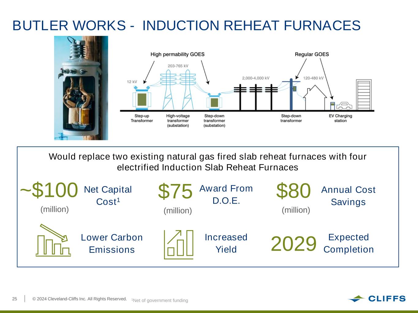 © 2024 Cleveland-Cliffs Inc.TERM0保留所有权利。25 BUTLER Works-INDUCTION REHEAT FURNACES低碳排放提高产量净资本成本1来自D.O.E.的奖励年度成本节约~$ 100(million)$ 75(million)$ 80(million)将用四个电气化感应板坯再热炉取代现有的两个天然气燃烧板坯再热炉预计完成2029 1政府资金净额