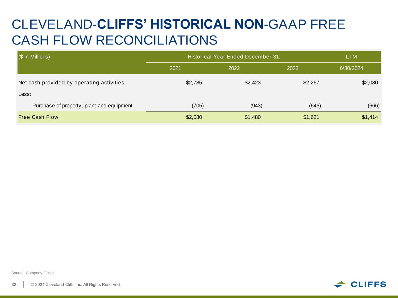 © 2024 Cleveland-Cliffs Inc.TERM0保留所有权利。32克里夫兰-克利夫斯历史上的非公认会计准则自由现金流对账来源:公司备案(百万美元)截至12月31日的历史年度,LTM20212022202220236/30/2024经营活动提供的现金净额$ 2,785 $ 2,423 $ 2,267 $ 2,080减:购买不动产、厂房和设备(705)(943)(646)(666)自由现金流$ 2,080 $ 1,480 $ 1,621 $ 1,414