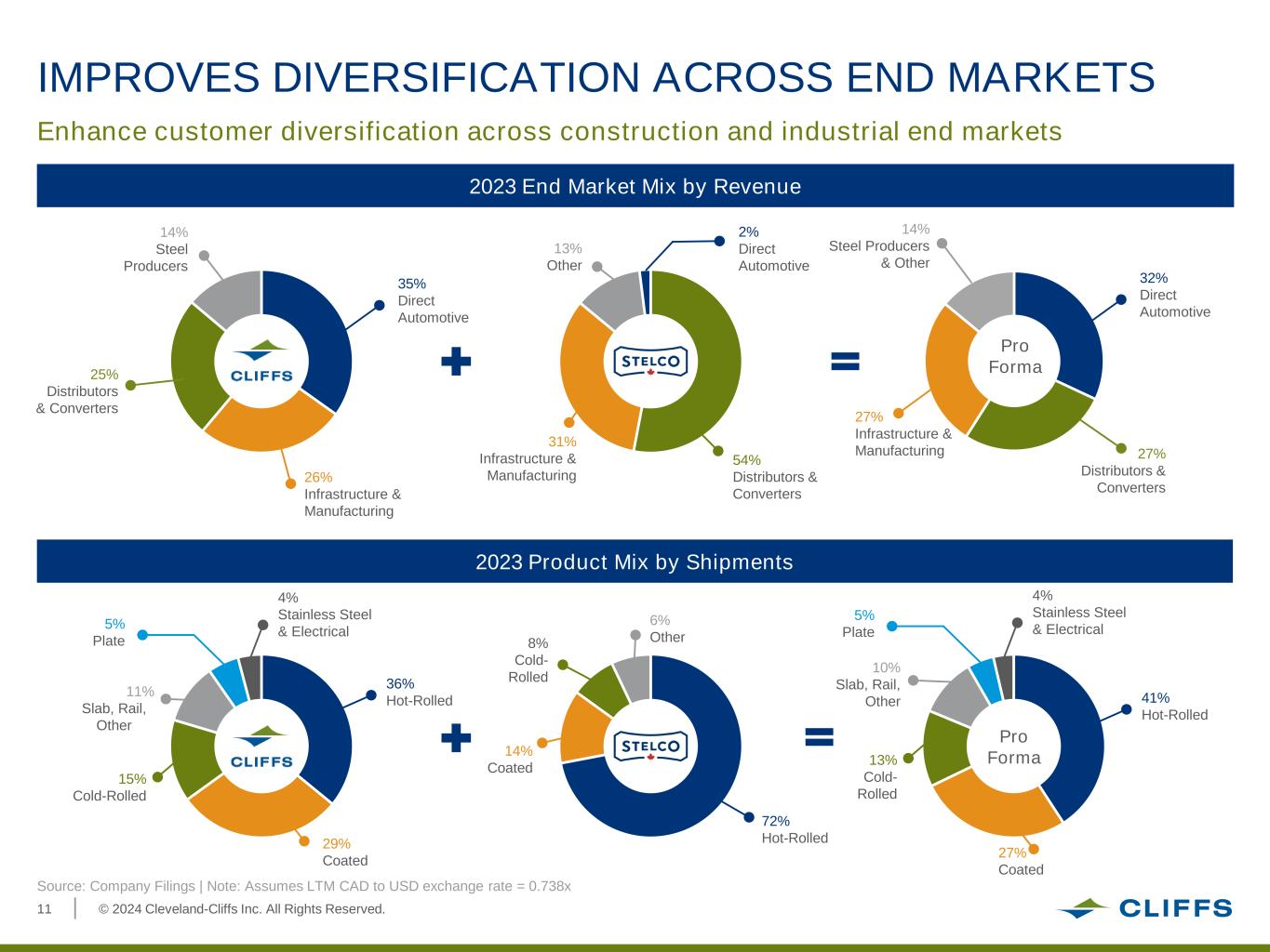 © 2024 Cleveland-Cliffs Inc.TERM0保留所有权利。9 2.5 NT来源:公司备案|注:截至2024年6月30日的LTM |(1)不包括协同效应|(2)使用平均LTM加元/美元0.738x换算成美元的数字|注:调整后EBITDA是非GAAP和非IFRS财务指标。有关与公司最接近的GAAP财务指标和Stelco的IFRS财务指标的对账(如适用),请参阅本演示文稿的附录LTM销售和钢铁出货量LTM调整后。EBITDA *和利润率7.8% 17.3%(1)9.1%备考备考增加规模,并使收入流跨地区多样化,新客户立即提高利润率,即使是协同效应前的$ 2,105(2)$ 21,008 $ 23,11316.1新台币18.6新台币进一步提升规模和利润率高度战略性交易提升Cliffs的规模和利润率状况协同效应S h ip m e n ts a n d s a le s i n m ill io n s $ i n m ill io n s $ 1,630 $ 2,114 $ 364(2)$ 120