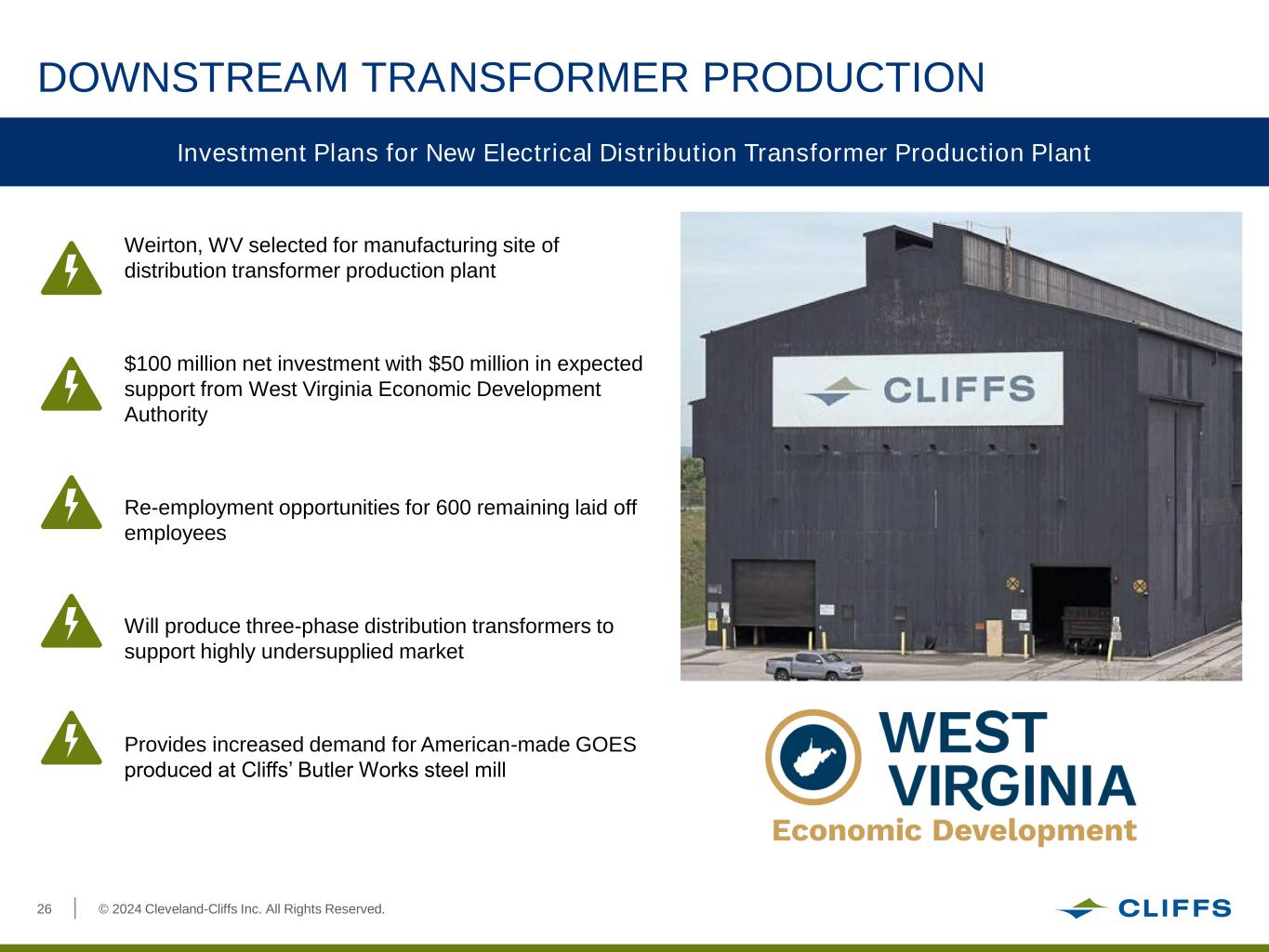© 2024 Cleveland-Cliffs Inc.TERM0保留所有权利。26 DownStream Transformer Production Weirton,WV被选为配电变压器生产厂的生产地点净投资1亿美元,预计将得到西弗吉尼亚州经济发展局5000万美元的支持,为600名剩余的下岗员工提供再就业机会,将生产三相配电变压器,以支持供应严重不足的市场,前提是对Cliffs的Butler Works钢厂生产的美国制造GOES的需求增加,新的配电变压器生产厂的投资计划