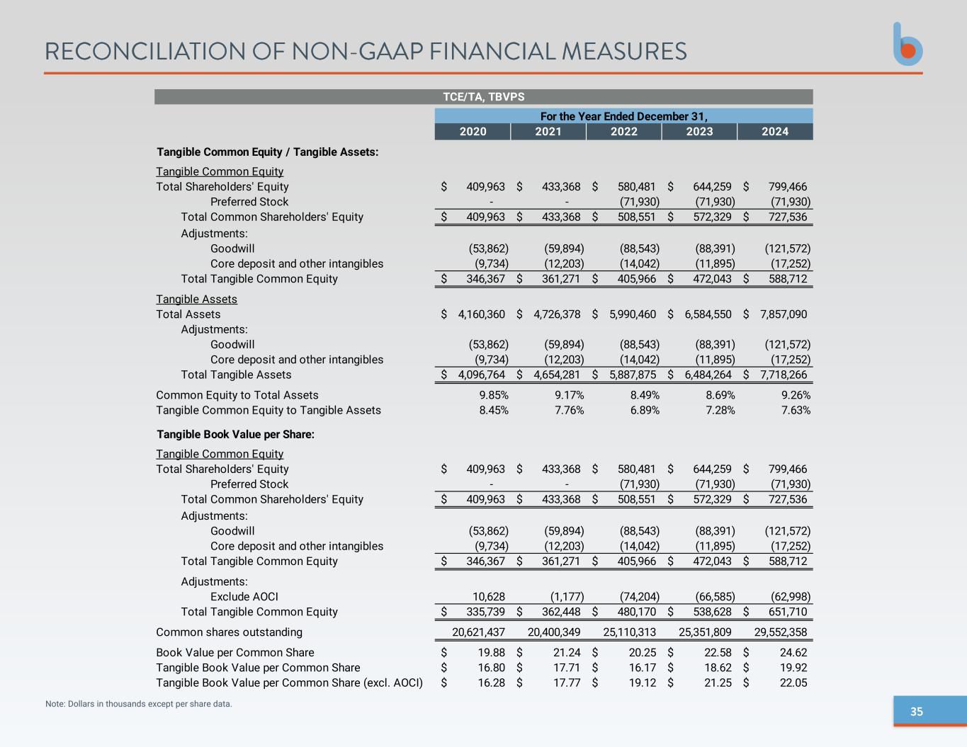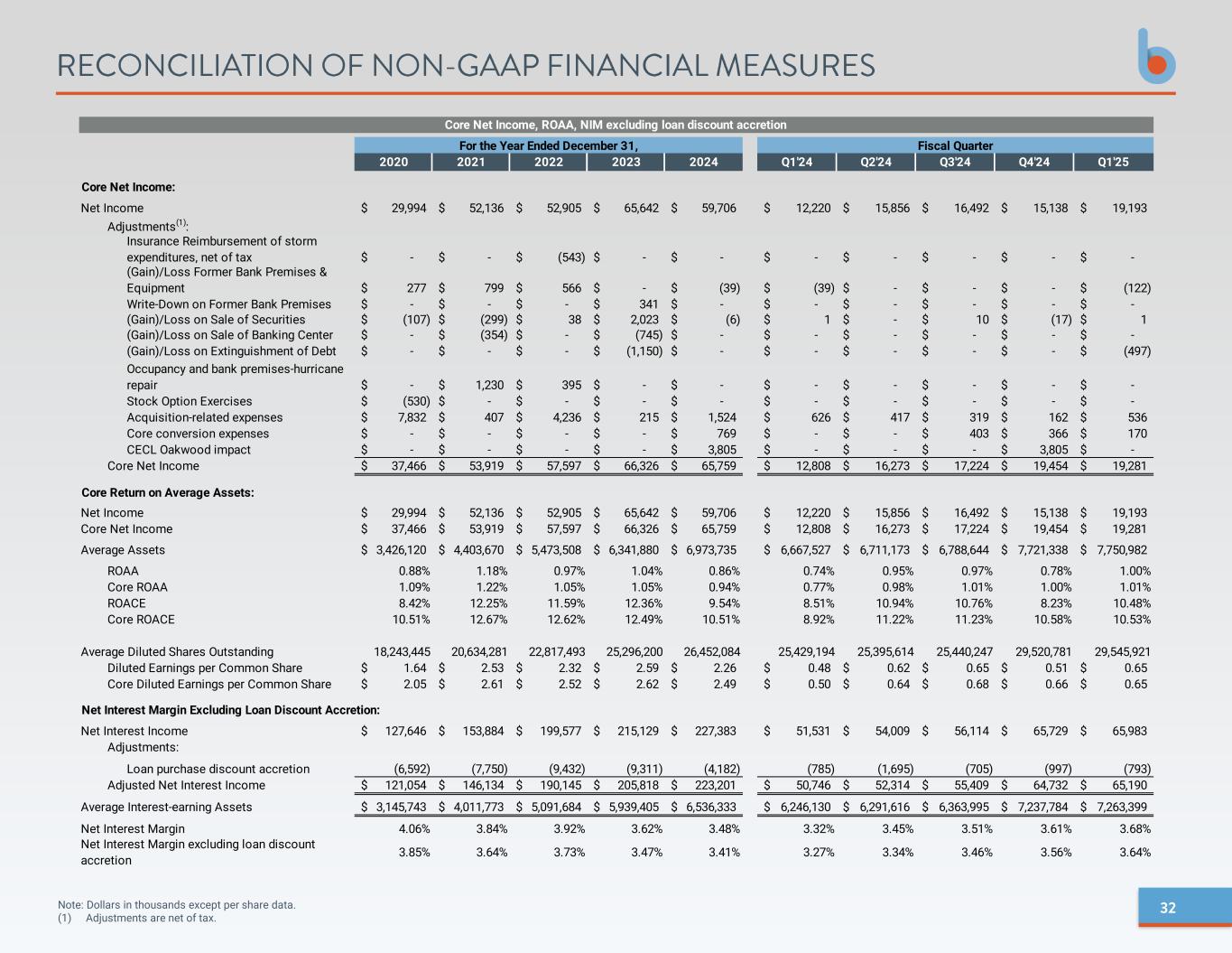 注:除每股数据外,单位为千美元。(1)调整为税后净额。20202021202220232024 Q1‘24 Q2’24 Q3‘24 Q4’24 Q1 ' 25核心净收入:净收入29,994 $ 52,136 $ 52,905 $ 65,642 $ 59,706 $ 12,220 $ 15,856 $ 16,492 $ 15,138 $ 19,193 $调整(1):-$-$(543)$-$-$-$-$-$-$-$ 277 $ 799 $ 566 $-$(39)$(39)$-$-$-$(122)$-$-$-$ 341 $-$-$-$-$-$(107)$(299)$ 38 $ 2,023 $(6)$ 1 $-$ 10 $(17)$ 1 $-$(354)$-$(745)$-$-$-$-$-$-$-$-$-$ 7,832 $ 407 $ 4,236 $ 215 $ 1,524 $ 626 $ 417 $ 319 $ 162 $ 536 $-$-$-$-$ 769 $-$-$ 403 $ 366 $ 170 $-$-$-$-$ 3,805 $-$-$ 3,805 $-$核心净收入37,466 $ 53,919 $ 57,597 $ 66,326 $ 65,759 $ 12,808 $ 16,273 $ 17,224 $ 19,454 $ 19,281 $核心平均资产回报率:净收入29,994美元52,136美元52,905美元65,642美元59,706美元12,220美元15,856美元16,492美元15,138美元19,193美元0.95% 0.97% 0.78% 1.00%核心ROAA 1.09% 1.22% 1.05% 1.05% 0.94% 0.77% 0.98% 1.01% 1.00% 1.01% ROACE 8.42% 12.25% 11.59% 12.36% 9.54% 8.51% 10.94% 10.76% 8.23% 10.48%核心ROACE 10.51% 12.67% 12.62% 12.49% 10.51% 8.92% 11.22% 11.23% 10.58% 10.53%平均稀释已发行股份18,243,44520,634,28122,817,49325,296,20026,452,08425,429,19425,395,61425,440,24729,520,78129,545,921稀释后每股普通股收益1.64美元2.53美元2.32美元2.59美元2.26美元0.48美元0.62美元0.65美元0.51美元0.65美元核心稀释51,531美元54,009美元56,114美元65,729美元65,983美元调整数:(6,592)(7,750)(9,432)(9,311)(4,182)(785)(1,695)(705)(997)(793)调整后净利息收入121,054美元146,134美元190,145美元205,818美元223,201美元50,746美元52,314美元55,409美元64,732美元65,190美元平均生息资产3,145,743美元4,011,773美元5,091,684美元5,939,405美元6,536,333美元6,246,130美元6,291,616美元6,363,995美元7,237,784美元7占用和银行房地-飓风修复股票期权行使与收购相关的费用截至12月31日止年度的核心净收入、ROAA、NIM(不包括贷款折扣增值)、财政季度保险报销风暴支出,净额税(收益)/损失前银行房地和前银行房地的设备减记