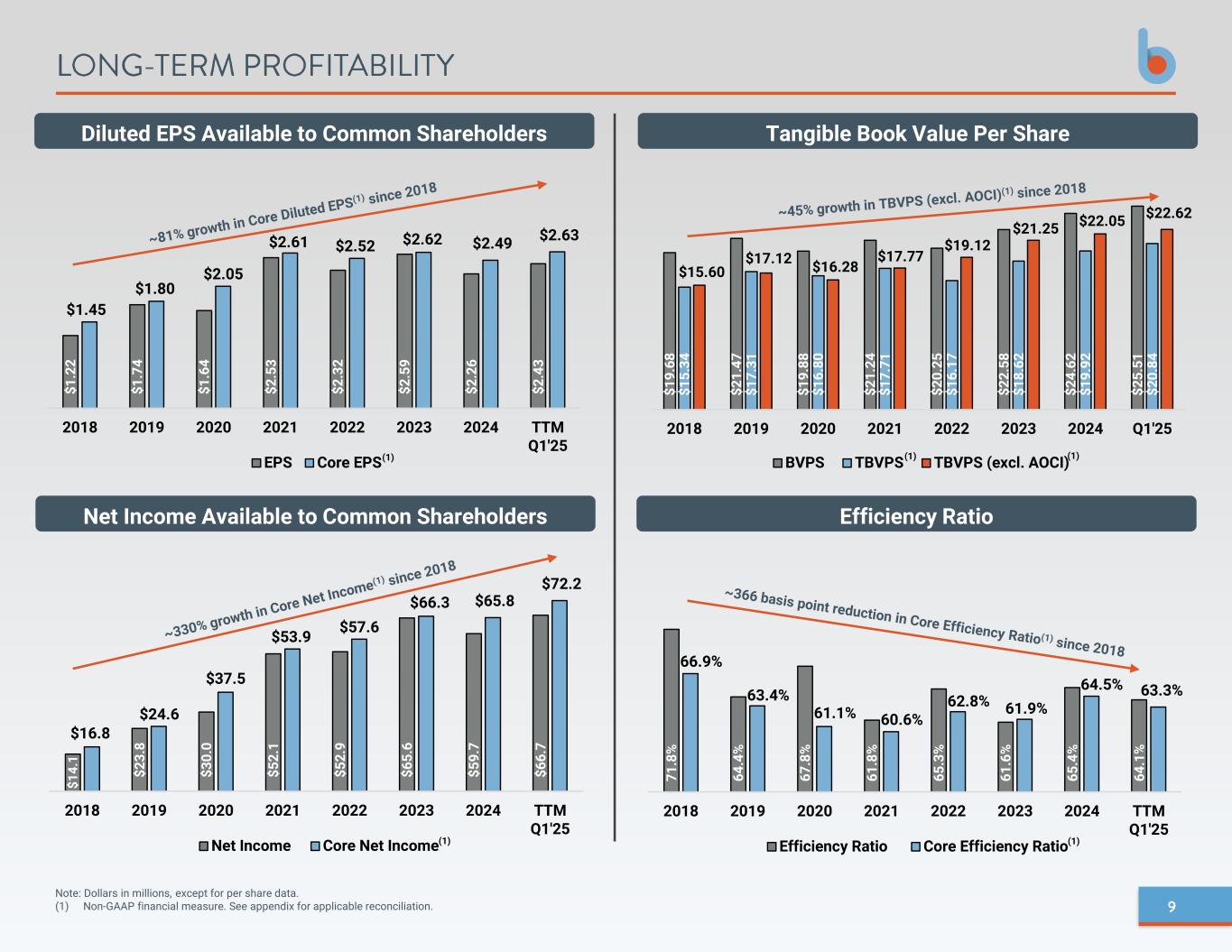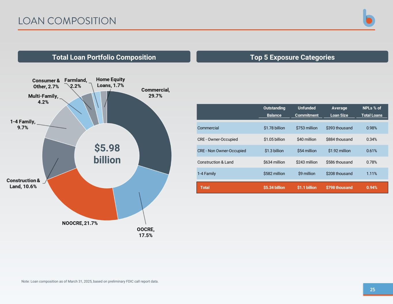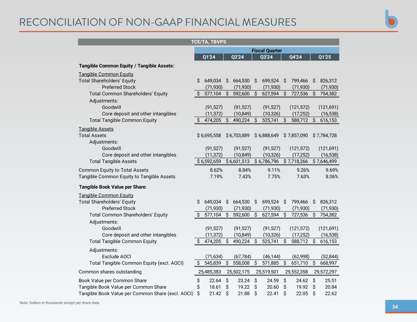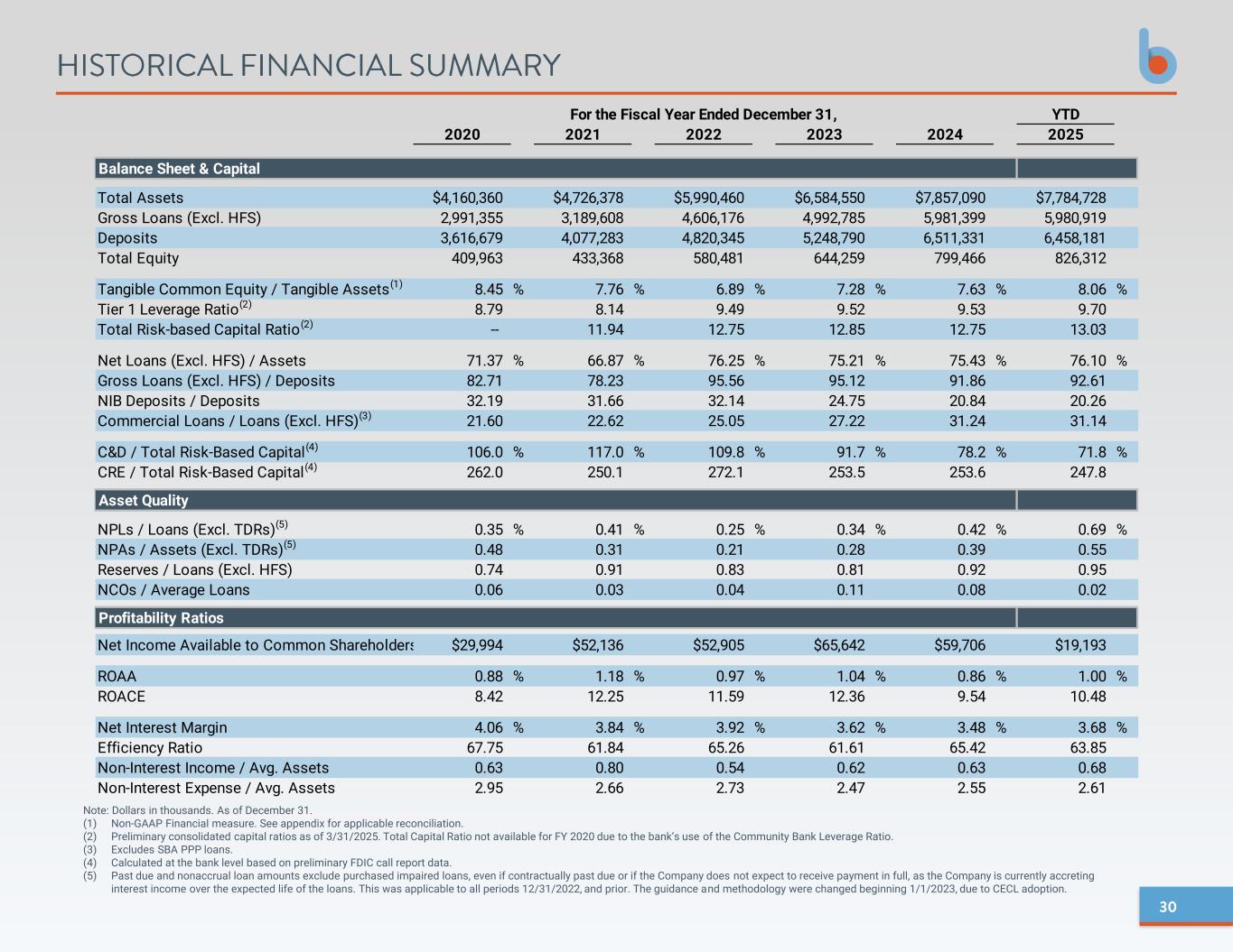 注:单位:千美元。截至12月31日。(1)Non-GAAP财务指标。适用的调节见附录。(2)截至2025年3月31日的初步合并资本比率。由于银行使用社区银行杠杆比率,2020财年不提供总资本比率。(3)不包括SBA PPP贷款。(4)根据初步FDIC呼叫报告数据在银行层面进行计算。(5)逾期和非应计贷款金额不包括已购买的减值贷款,即使合同已逾期或公司预计不会收到全额付款,因为公司目前正在贷款的预期期限内增加利息收入。这适用于12/31/2022及之前的所有期间。由于采用了CECL,该指南和方法从2023年1月1日开始发生了变化。年初至今202020212022202320242025资产负债表和资本总资产$ 4,160,360 $ 4,726,378 $ 5,990,460 $ 6,584,550 $ 7,857,090 $ 7,784,728贷款总额(不含HFS)2,991,3553,189,6084,606,1764,992,7855,981,3995,980,919存款3,616,6794,077,2834,820,3455,248,7906,511,3316,458,181总权益409,963433,368580,481644,259799,466826,312有形共同权益/有形资产(1)8.45% 7.76% 6.89% 7.28% 7.63% 8.06%一级杠杆率(2)8.7 98.14 9.499.52 9.539.70总风险资本比率(2)--11.94 12.75 12.85 12.75 13.03净贷款(不含HFS)/资产71.37% 66.87% 76.25% 75.21% 75.43% 76.10%总贷款(不含HFS)/存款82.7 178.2395.56 95.12 91.86 92.61 NIB存款/存款32.1931.6632.14 24.75 20.84 20.26商业贷款/贷款(不含HFS)(3)21.6022.62 25.05 27.22 31.24 31.14建发/风险资本总额(4)106.0% 117.0% 109.8% 91.7% 78.2% 71.8% CRE/风险资本总额(4)262.02 50.127 2.1253.5253.6247.8资产质量不良贷款/贷款(不含TDR)(5)0.35% 0.41% 0.25% 0.34% 0.42% 0.69%不良资产/资产(不含税TDR)(5)0.48 0.3 10.2 10.28 0.39 0.55准备金/贷款(不含HFS)0.74 0.9 10.83 0.8 10.92 0.95 NCO/平均贷款0.06 0.03 0.04 0.1 10.08 0.02利润率普通股股东可获得的净收入29,994美元52,136美元52,905美元65,642美元59,706美元19,193美元ROAA 0.88% 1.18% 0.97% 1.04% 0.86% 1.00% ROACE 8.42 12.25 11.59 12.36 9.54 10.48净息差4.06% 3.84% 3.92% 3.62% 3.48% 3.68%效率比67.7561.84 65.2661.61 65.4263.85非利息收入/平均资产0.63 0.80 0.54 0.62 0.63 0.68非利息费用/平均截至12月31日财年资产2.95 2.66 2.73 2.47 2.55 2.61,