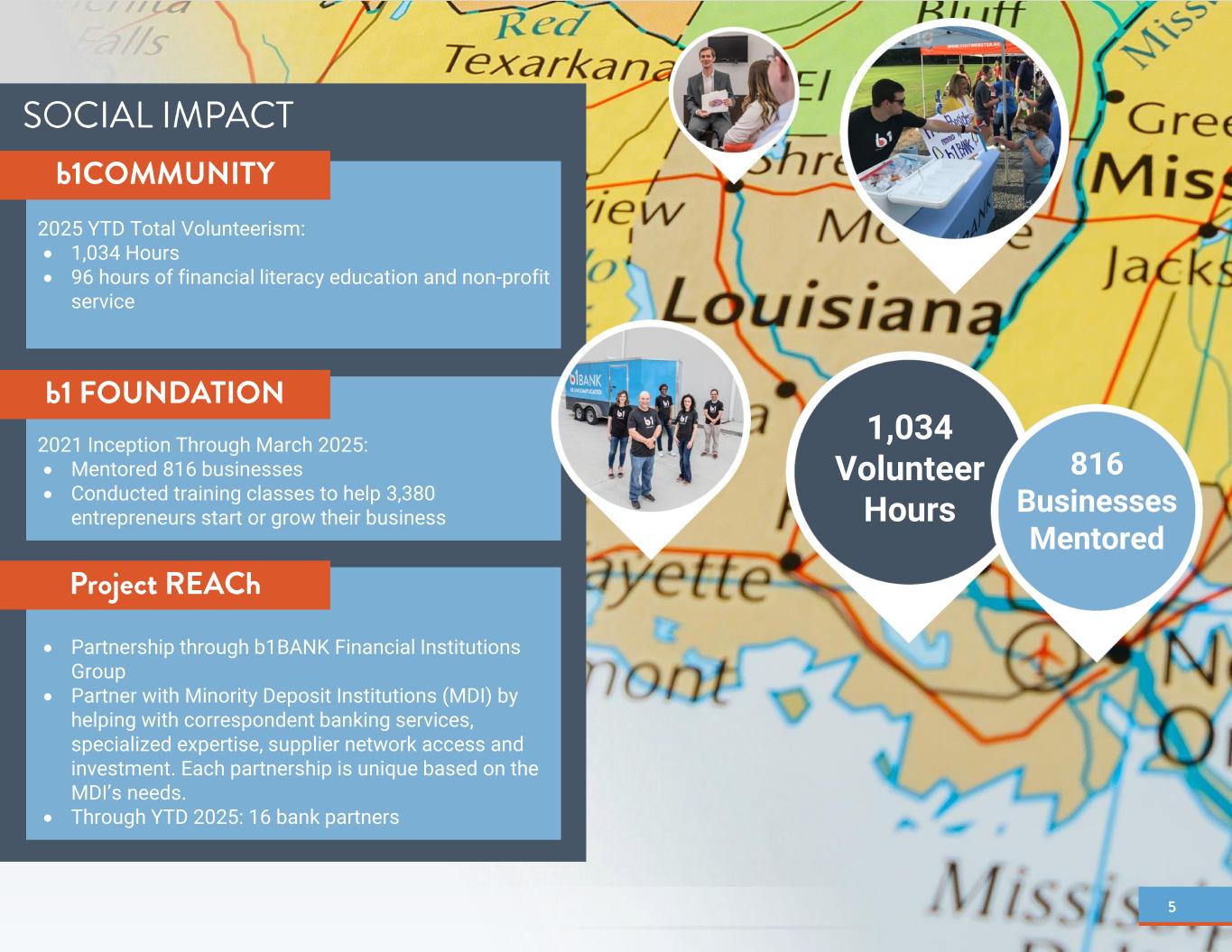 2025年初至今全面志愿服务:• 1,034小时• 96小时金融知识教育和非营利服务•通过B1BANK 金融机构集团建立合作伙伴关系•通过帮助提供代理银行服务、专业知识、供应商网络准入和投资,与少数群体存款机构(MDI)建立合作伙伴关系。基于MDI的需求,每一种伙伴关系都是独一无二的。• 2025年年初至今:16家银行合作伙伴2021年入行至2025年3月:•指导816家企业•举办培训班,帮助3380名企业家开办或发展企业1034志愿小时816家企业得到指导