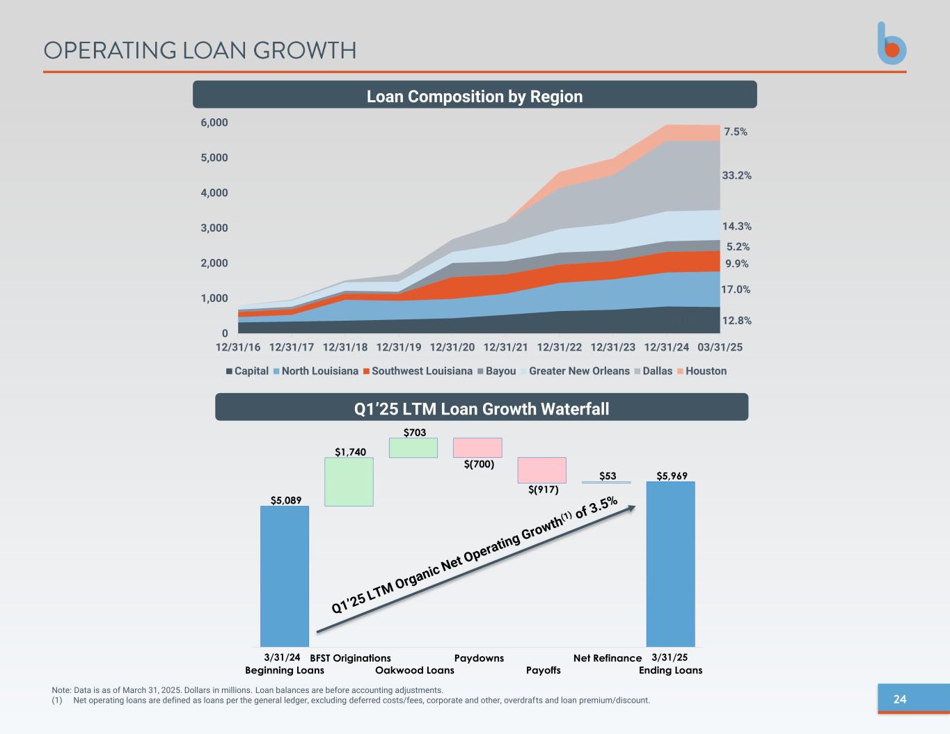 注:数据截至2025年3月31日。百万美元。贷款余额为会计调整前。(1)净经营贷款定义为按总分类账计算的贷款,不包括递延成本/费用、公司及其他、透支和贷款溢价/贴现。各地区贷款构成13.0% 12.8% 17.0% 9.9% 5.2% 14.3% 33.2% 7.5% 01,0002,0003,0004,0005,0006,00012/31/1612/31/1712/31/1812/31/1912/31/2012/31/2112/31/2212/31/2312/31/2403/31/25 Capital North Louisiana Southwest Louisiana Bayou Greater New Orleans Dallas Houston Q1’25 LTM Loan Growth Waterfall $ 1,740 $ 703 $(700)$(917)$ 53 $ 5,969 $ 5,089期初贷款BFST来源Oakwood Loans Paydowns Payoffs Net Refinance Ending Loans 3/31/243/31/25