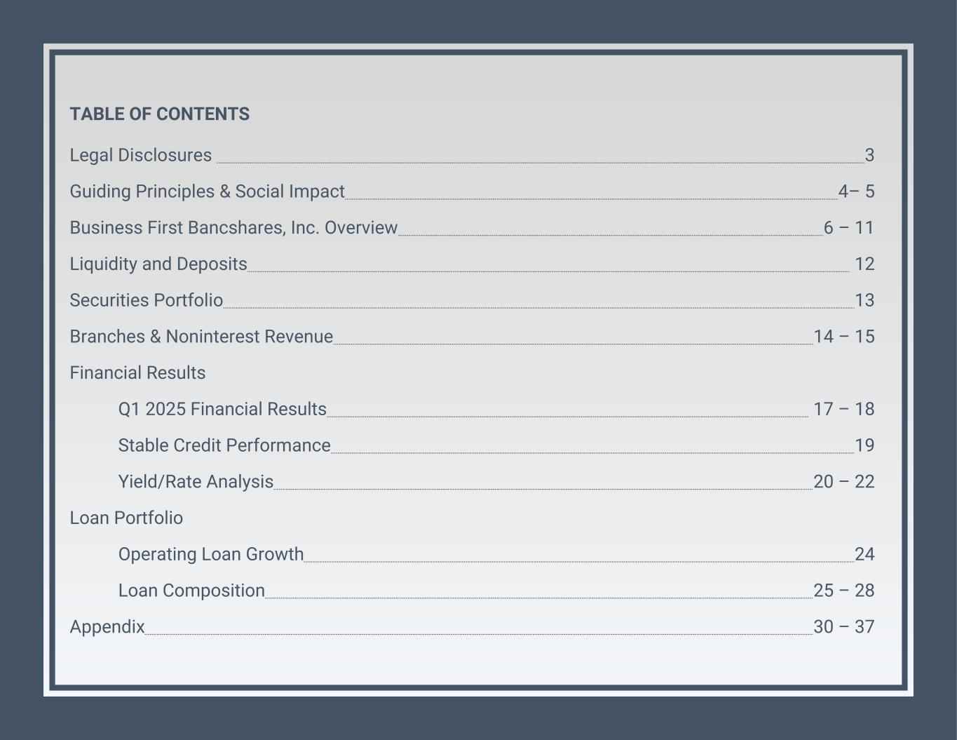 目录法律披露3指导原则和社会影响4 – 5 Business First Bancshares, Inc.概览6 – 11流动性和存款12证券组合13分支机构和非利息收入14 – 15财务业绩2025年第一季度财务业绩17 – 18信用表现稳定19收益率/利率分析20 – 22贷款组合经营贷款增长24贷款构成25 – 28附录30 – 37