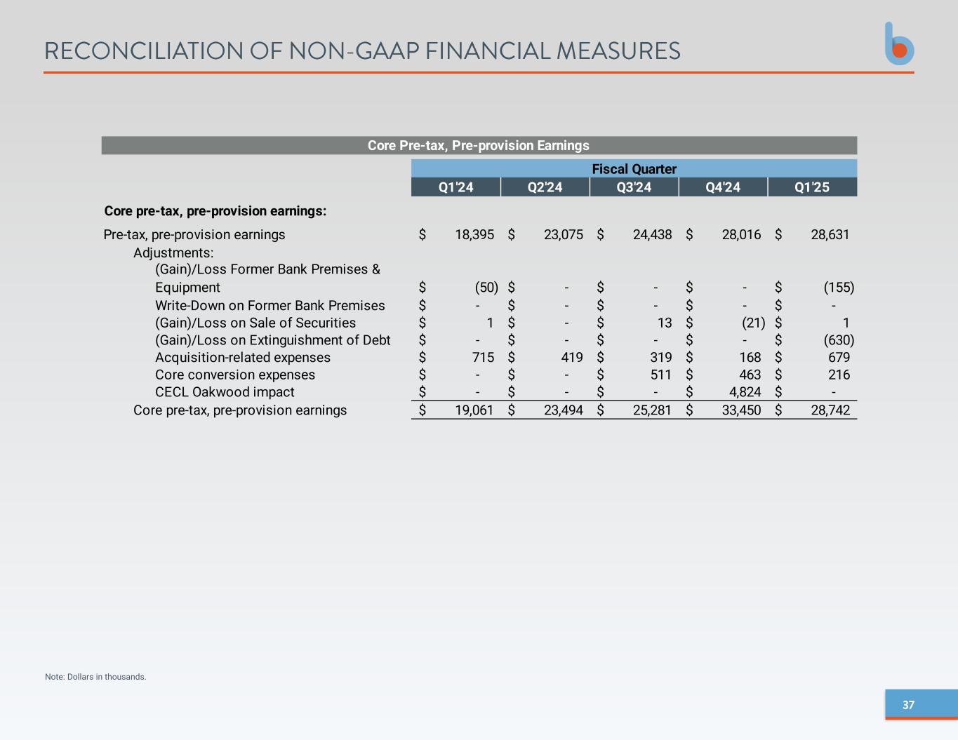 注:单位:千美元。Q1‘24 Q2’24 Q3‘24 Q4’24 Q1 ' 25核心税前、拨备前收益:税前、拨备前收益18,395美元23,075美元24,438美元28,016美元28,631美元调整:(50)$-$-$-(155)$-$-$-$-$-$ 1 $-$ 13 $(21)$ 1 $-$-$-$-$-$(630)$ 715 $ 419 $ 319 $ 168 $ 679 $-$ 511 $ 463 $ 216 $-$-$-$-$ 4,824 $-$核心税前、拨备前收益19,061美元23,494美元25,281美元33,450美元28,742美元收购相关费用核心转换费用CECL Oakwood影响核心税前、拨备前收益