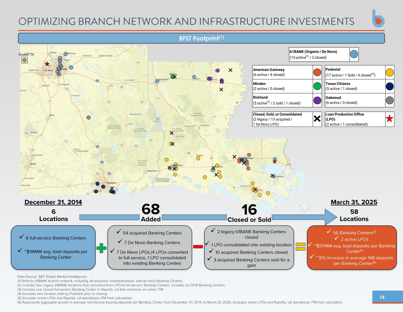 丨丨丨丨丨丨丨丨丨丨丨丨丨丨丨丨丨丨BFST足迹(1)American Gateway(6 active/4 closed)Pedestal(17 active/1 sold/4 closed(4))Minden(2 active/0 closed)Texas Citizens(5 active/1 closed)Richland(5 active(3)/2 sold/1 closed)Oakwood(6 active/0 closed)closed,sold,or consolidated(2 legacy/13 acquired/1 de novo LPO)Loan Production Office(LPO)(2 active/1 closed)Snyder,TX b1bANK(organic/