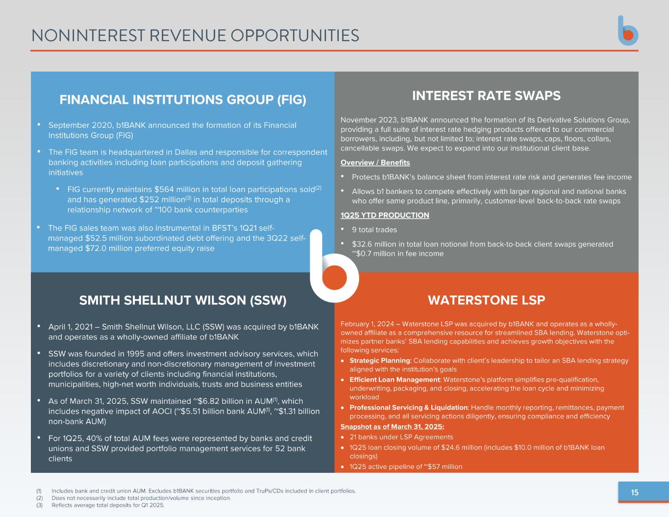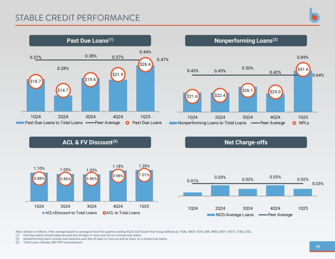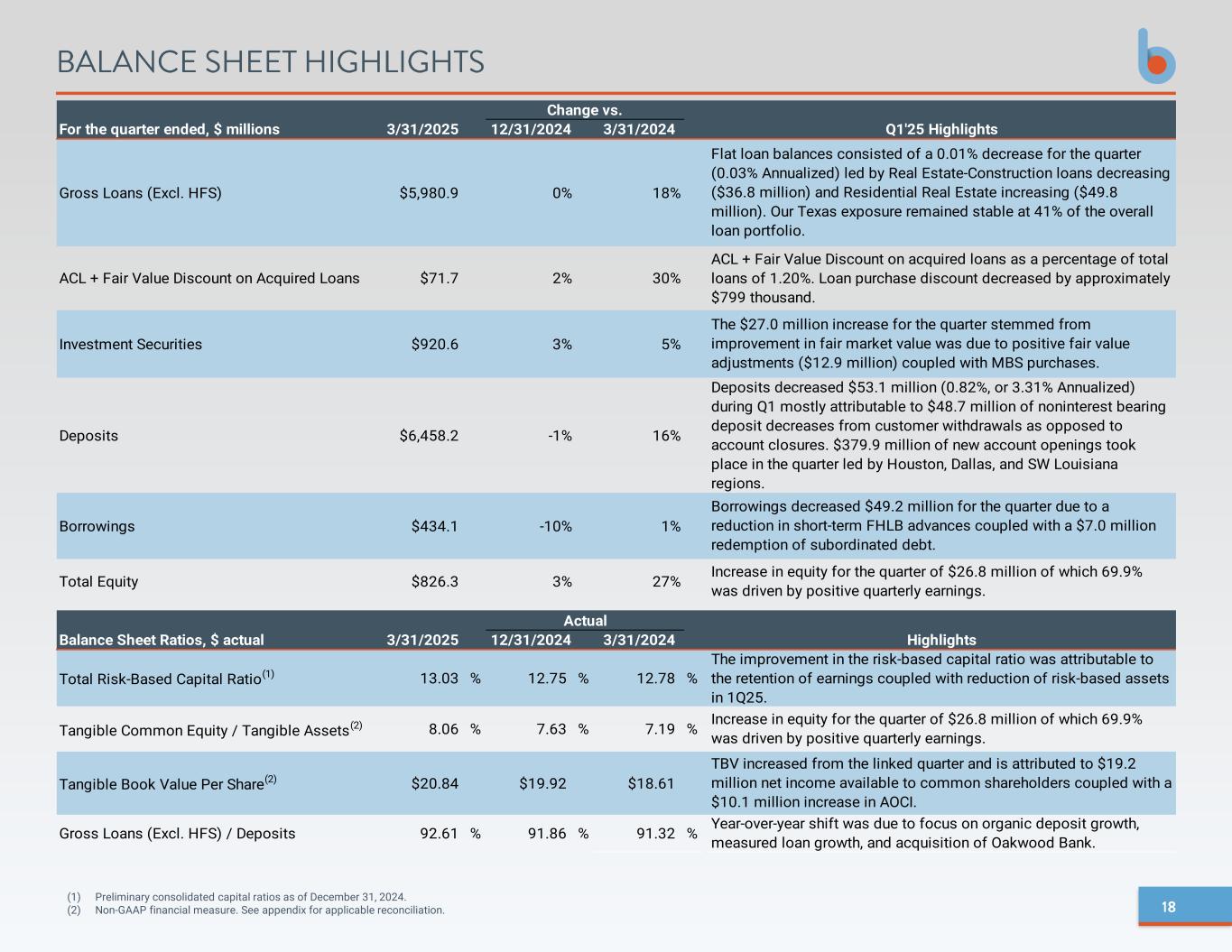 (1)截至2024年12月31日的初步合并资本比率。(2)Non-GAAP财务计量。适用的调节见附录。截至本季度,百万美元3/31/202512/31/20243/31/2024贷款毛额(不含HFS)$ 5,980.90% 18% ACL +收购贷款的公允价值折扣$ 71.72% 30%投资证券$ 920.63.5%存款$ 6,458.2-1 % 16%借款$ 434.1-10 %1%总权益$ 826.33% 27%资产负债表比率,$实际3/31/202512/31/20243/31/2024总风险资本比率(1)13.03% 12.75% 12.78%有形普通股权益/有形资产(2)8.06% 7.63% 7.19%每股有形账面价值(2)$ 20.84 $ 19.92 $ 18.61总贷款(不含HFS)/存款92.61% 91.86% 91.32%与25年第一季度相比的实际变化亮点持平贷款余额包括本季度下降0.01%(年化0.03%),主要是房地产-建筑贷款减少(3680万美元)和住宅房地产增加(4980万美元)。我们在德克萨斯州的敞口保持稳定,占整体贷款组合的41%。第一季度存款减少5310万美元(0.82%,或年化3.31%),主要是由于客户提款导致的4870万美元无息存款减少,而不是账户关闭。本季度有3.799亿美元的新开户发生在休斯顿、达拉斯和西南路易斯安那州地区。ACL +收购贷款的公允价值折扣占贷款总额的百分比为1.20%。贷款购买折扣减少约79.9万美元。本季度2700万美元的增长源于公允市场价值的改善,这是由于积极的公允价值调整(1290万美元)以及MBS购买。同比变化是由于关注有机存款增长、衡量贷款增长以及收购奥克伍德银行。本季度借款减少了4920万美元,原因是短期FHLB预付款减少,加上赎回了700万美元的次级债。本季度股本增加2680万美元,其中69.9%是由积极的季度收益推动的。亮点本季度股本增加2680万美元,其中69.9%是由积极的季度收益推动的。TBV较上一季度有所增加,归因于普通股股东可获得的1920万美元净收益以及AOCI增加1010万美元。风险资本比率的改善归因于盈利的保留加上风险资产在1Q25的减少。