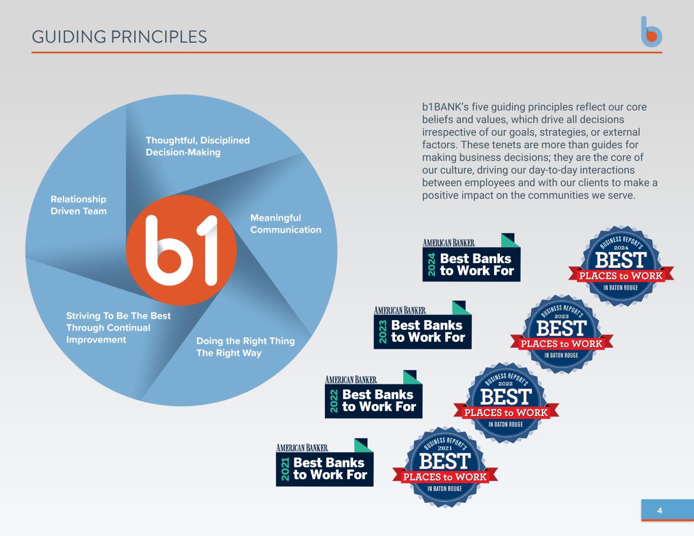b1BANK的五大指导原则反映了我们的核心信念和价值观,无论我们的目标、战略或外部因素如何,这些信念和价值观驱动着所有决策。这些信条不仅仅是做出商业决策的指南;它们是我们文化的核心,推动我们在员工之间和与客户之间的日常互动,从而对我们所服务的社区产生积极影响。