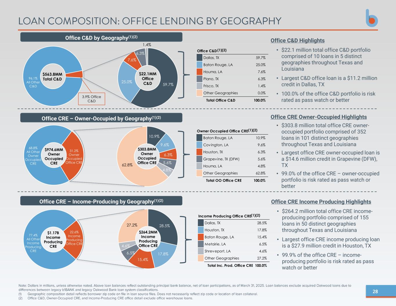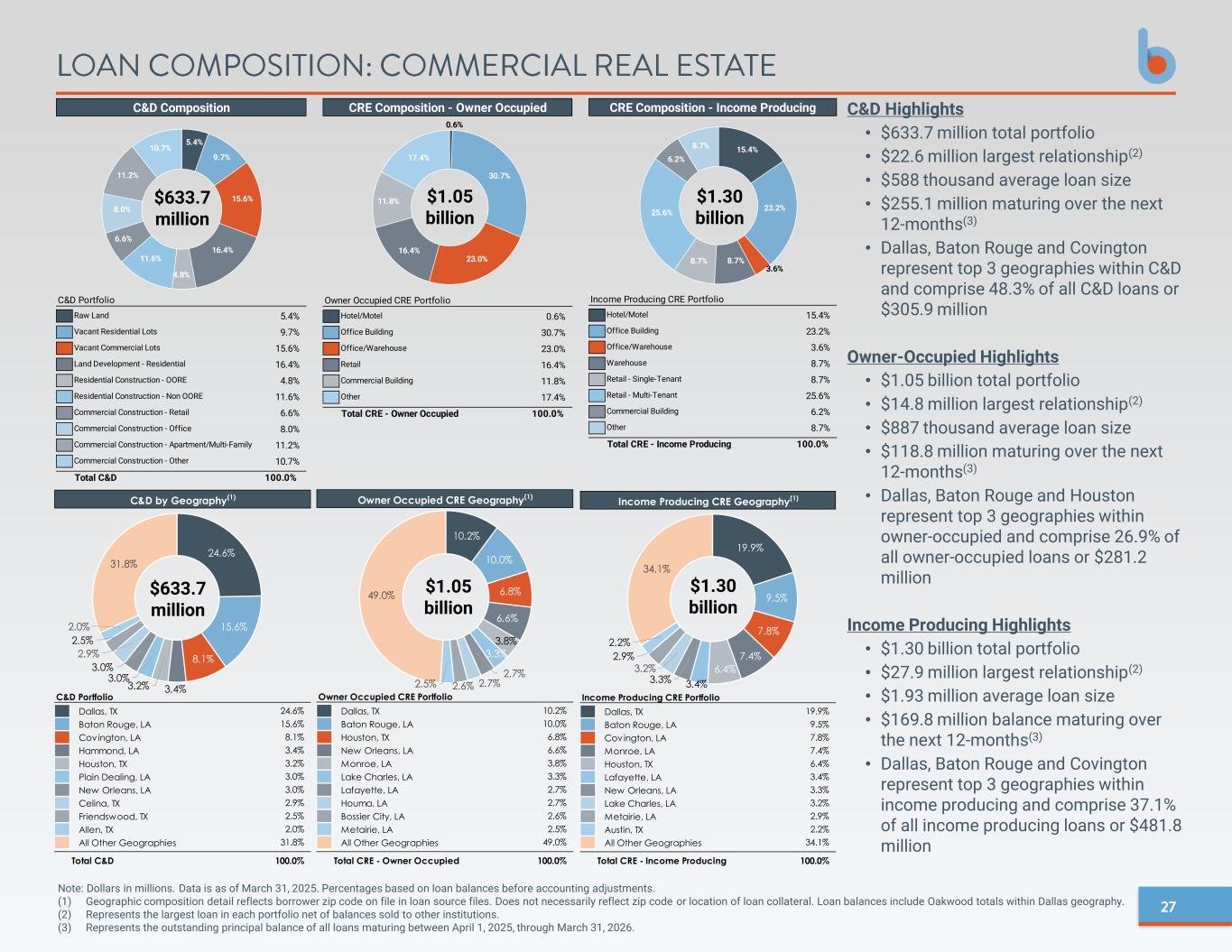 建发构成CRE构成-业主占用建发投资组合原地5.4%空置住宅地段9.7%空置商业地段15.6%土地开发-住宅16.4%住宅建筑-OORE 4.8%住宅建筑-非OORE 11.6%商业建筑-零售6.6%商业建筑-办公8.0%商业建筑-公寓/多户家庭11.2%商业建筑-其他10.7%合计建发100.0% 5.4% 9.7% 15.6% 16.4% 4.8% 11.6% 6.6% 8.0% 11.2% 10.7%收入产生CRE地理(1)收入产生CRE投资组合达拉斯,德克萨斯州19.9%巴吞鲁日,洛杉矶9.5%科文顿,洛杉矶7.8%门罗,洛杉矶7.4%休斯顿,德克萨斯州6.4%拉斐特,洛杉矶3.4%新奥尔良,LA 3.3% Lake Charles,LA 3.2% Metairie,LA 2.9% Austin,TX 2.2% All Other Geographies 34.1% Total CRE-Income Producing 100.0% 19.9% 9.5% 7.8% 7.4% 6.4% 3.4% 3.3% 3.2% 2.9% 2.2% 34.1% Owner Occupied CRE Geography(1)Incupied CRE Portfolio Dallas,TX 10.2% Baton Rouge,LA 10.0% Houston,TX 6.8% New Orleans,LA 6.6% Monroe,LA 3.8% Lake Charles,LA 3.3% Lafayette,LA 2.7% Houma,LA 2.7% Bossier City,LA 2.6% Metairie,LA 2.5%所有其他地区49.0% CRE总额-所有者占用100.0% 10.2% 10.0% 6.8% 6.6% 3.8% 3.3% 2.7% 2.7% 2.6% 2.5% 49.0% C & D by Geography(1)Own r Occupied CRE Geography(1)C & D Portfolio Dallas,TX 24.6% Baton Rouge,LA 15.6% Covington,LA 8.1% Hammond,LA 3.4% Houston,TX 3.2% Plain Dealing,LA 3.0% New Orleans,LA 3.0% Celina,TX 2.9% Friendswood,TX 2.5% Allen,TX 2.0% All Other Geographies 31.8% Total C & D 100.0% 24.6% 15.6% 8.1% 3.4% 3.2% 3.0% 2.9% 2.5% 2.0% 31.8%注:百万美元。数据截至2025年3月31日。基于会计调整前贷款余额的百分比。(1)地理组成细节反映贷款来源档案中存档的借款人邮编。不一定反映邮政编码或贷款抵押品的位置。贷款余额包括达拉斯地理范围内的奥克伍德总额。(2)表示每个投资组合中扣除出售给其他机构的余额后的最大贷款。(3)表示2025年4月1日至2026年3月31日期间到期的所有贷款的未偿还本金余额。建发亮点•总投资组合6.337亿美元•最大关系2260万美元(2)•平均贷款规模58.8万美元• 2.551亿美元在未来12个月内到期(3)•达拉斯、巴吞鲁日和科温顿代表建发内排名前3位的地区,占所有建发贷款的48.3%或3.059亿美元自住亮点•总投资组合10.5亿美元•最大关系1480万美元(2)•平均贷款规模88.7万美元• 1.188亿美元在未来12个月内到期(3)•达拉斯,巴吞鲁日和休斯顿是自住贷款中排名前3位的地区,占所有自住贷款的26.9%或2.812亿美元的创收亮点•总投资组合13.0亿美元•最大关系2790万美元(2)•平均贷款规模193万美元•未来12个月内到期的余额1.698亿美元(3)•达拉斯,巴吞鲁日和科文顿代表了创收领域排名前3的地区占所有创收贷款的37.1%,即4.818亿美元6.337亿美元10.5亿美元13.00亿美元10.5亿美元13.00亿美元CRE构成-创收业主占用CRE组合酒店/莫泰0.6%办公楼30.7%办公/仓库23.0%零售16.4%商业建筑11.8%其他17.4% CRE总额-业主占用100.0% 0.6% 30.7% 23.0% 16.4% 11.8% 17.4%收入产生CRE组合酒店/莫泰15.4%办公楼23.2%办公/仓库3.6%仓库8.7%零售-单租户8.7%零售-多租户25.6%商业建筑6.2%其他8.7% CRE总额-创收100.0% 15.4% 23.2% 3.6% 8.7% 25.6%