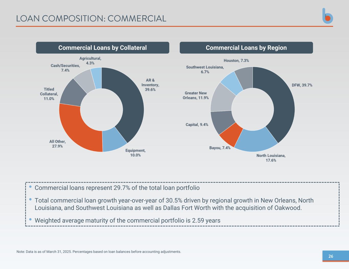 注:数据截至2025年3月31日。基于会计调整前贷款余额的百分比。•商业贷款占贷款组合总额的29.7% •商业贷款总额同比增长30.5%,这得益于新奥尔良、北路易斯安那州和路易斯安那州西南部以及收购奥克伍德后达拉斯沃思堡的区域增长。•商业组合加权平均期限为2.59年商业贷款按地区分类的抵押商业贷款