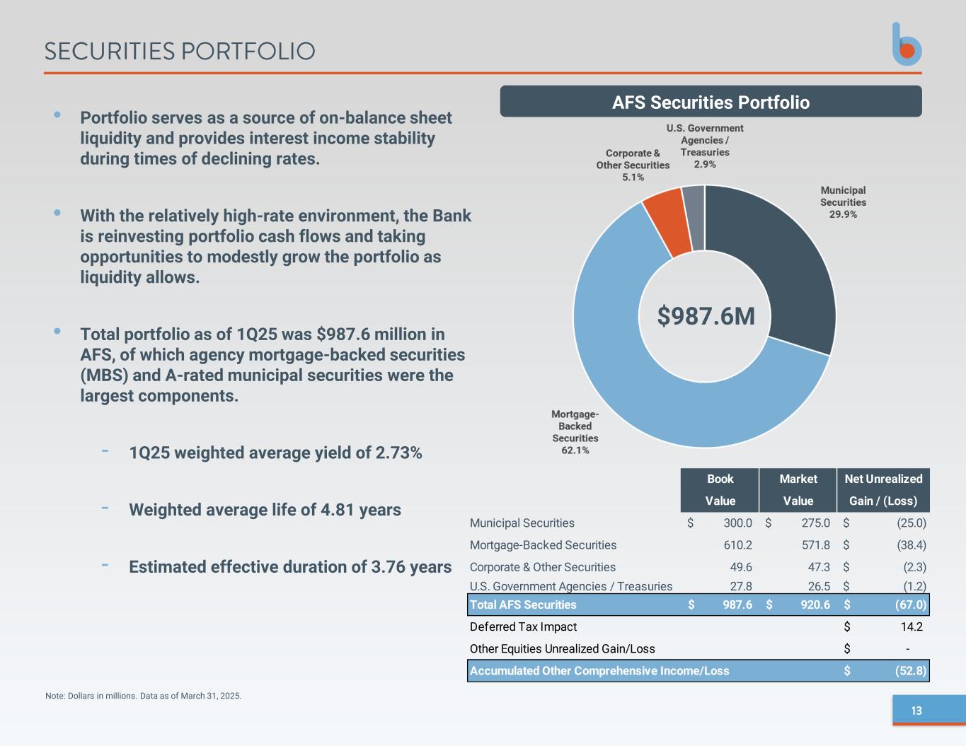 AFS证券投资组合•投资组合是表内流动性的来源,在利率下降期间提供利息收入稳定性。•在利率相对较高的环境下,该行正在对投资组合现金流进行再投资,并在流动性允许的情况下抓住机会适度增加投资组合。•截至25年第一季度,AFS总投资组合为9.876亿美元,其中机构抵押贷款支持证券(MBS)和A级市政证券是最大的组成部分。-2015年第一季度加权平均收益率2.73%-加权平均寿命4.81年-预计有效期限3.76年9.876亿美元注:百万美元。数据截至2025年3月31日。账面市场净未实现价值收益/(亏损)市政证券300.0 $ 275.0 $(25.0)$抵押贷款支持证券610.25 71.8(38.4)$企业和其他证券49.647.3(2.3)$美国政府机构/国债27.8 26.5(1.2)$ AFS证券总额987.6 $ 920.6 $(67.0)$递延税项影响14.2 $其他股票未实现收益/亏损-$累计其他综合收益/亏损(52.8)$