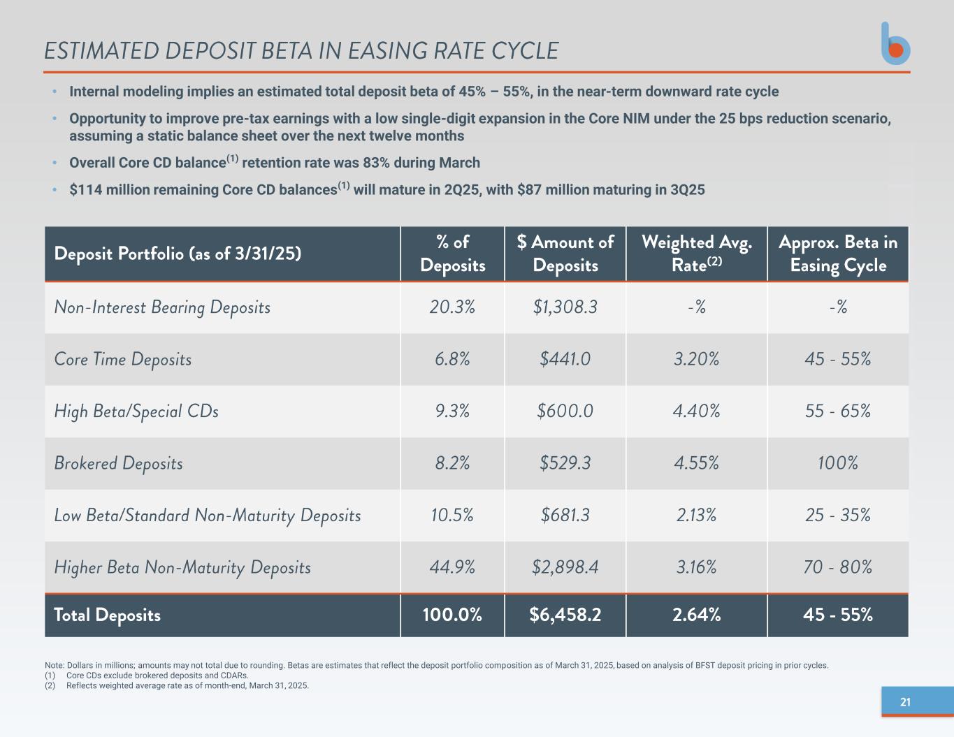 注:百万美元;由于四舍五入,金额可能不合计。Beta是基于对以往周期中BFST存款定价的分析得出的反映截至2025年3月31日存款组合构成的估计值。(1)核心CD不包括经纪存款和CDAR。(2)反映截至2025年3月31日月末的加权平均费率。•内部建模意味着,在近期利率下行周期中,估计总存款贝塔系数为45% – 55% •假设未来十二个月的资产负债表为静态,在25个基点的下调情景下,核心NIM有机会以低个位数扩张改善税前收益•总体核心CD余额(1)3月份的保留率为83% • 1.14亿美元的剩余核心CD余额(1)将在2Q25到期,其中8700万美元将在3Q25到期
