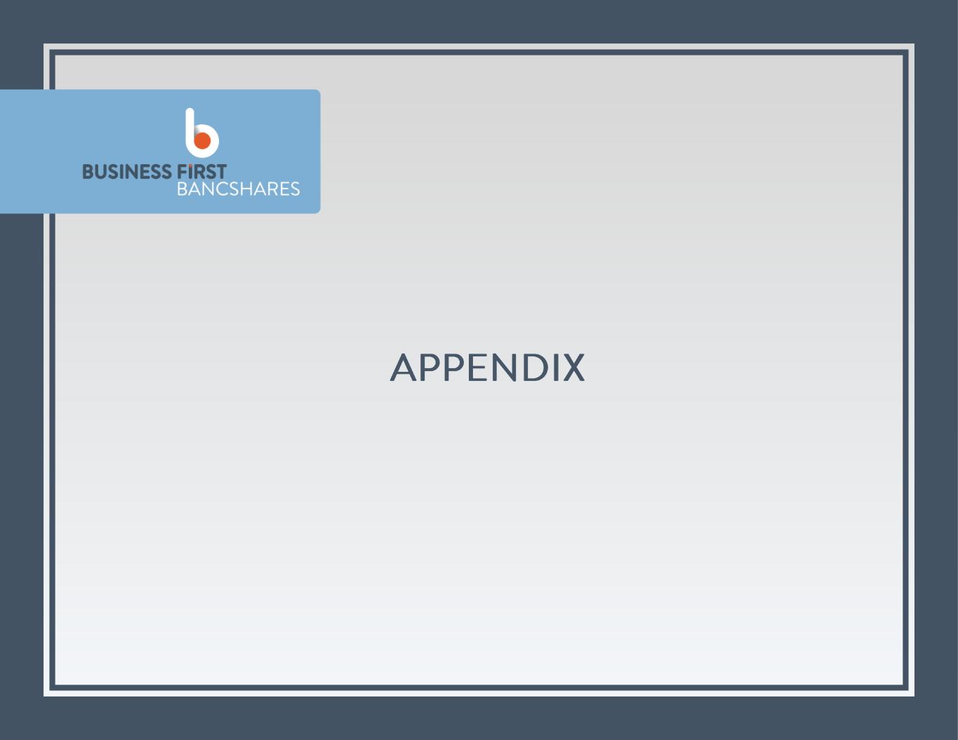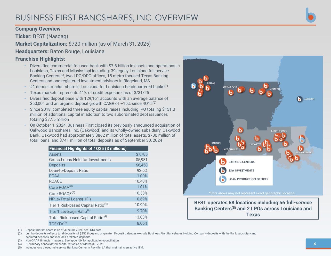 公司概况Ticker:BFST(纳斯达克)市值:7.2亿美元(截至2025年3月31日)总部:路易斯安那州巴吞鲁日特许经营亮点:•以商业为重点的多元化银行,在路易斯安那州、德克萨斯州和密西西比州拥有78亿美元的资产和业务,其中包括:39个传统的路易斯安那州全方位服务银行中心(5个)、两个LPO/DPO办事处、15个以大都市为重点的德克萨斯州银行中心以及位于密西西比州里奇兰的一个注册投资顾问• #总部位于路易斯安那州的银行在路易斯安那州的存款市场份额第一(1个)•德克萨斯州市场占信贷敞口的41%,截至3/31/25 •多元化存款基础,共有129,161个账户,平均余额为50,001美元,自2015年第四季度以来有机存款增长率CAGR约为16%(2)•自2018年以来,除了两次总额为7,750万美元的次级债发行外,还完成了包括IPO在内的三次股权融资,共计1.51亿美元的额外资本• 2024年10月1日,Business First完成了其先前宣布的对Oakwood Bancshares,Inc.(Oakwood)及其全资子公司Oakwood Bank的收购。截至2024年9月30日,Oakwood的总资产约为8.62亿美元,贷款总额为7亿美元,存款总额为7.41亿美元。BFST在58个地点设有业务,其中包括遍布路易斯安那州和德克萨斯州的56个全方位服务银行中心(5个)和2个LPO(1个)。根据FDIC的数据,截至2024年6月30日,存款市场份额为。(2)巨额存款反映总存款为25万美元或更多。存款余额不包括Business First Bancshares Holding Company在该银行子公司的存款和取得的存款,包括经纪存款。(3)Non-GAAP财务计量。适用的调节见附录。(4)截至2025年3月31日的初步合并资本比率。(5)包括位于洛杉矶雷维尔的一个封闭式全方位服务银行中心,该中心保持活跃的ITM。*上面的点可能并不代表确切的地理位置。资产$ 7,785为投资持有的贷款总额$ 5,981存款$ 6,458贷存比92.6% ROAA 1.00% ROACE 10.48%核心ROAA(3)1.01%核心ROACE(3)10.53%不良贷款/贷款总额(HFI)0.69%一级风险资本比率(4)10.90%一级杠杆率(4)9.70%总风险资本比率(4)13.03% TCE/TA(3)8.06% 25年第一季度财务摘要(百万美元)