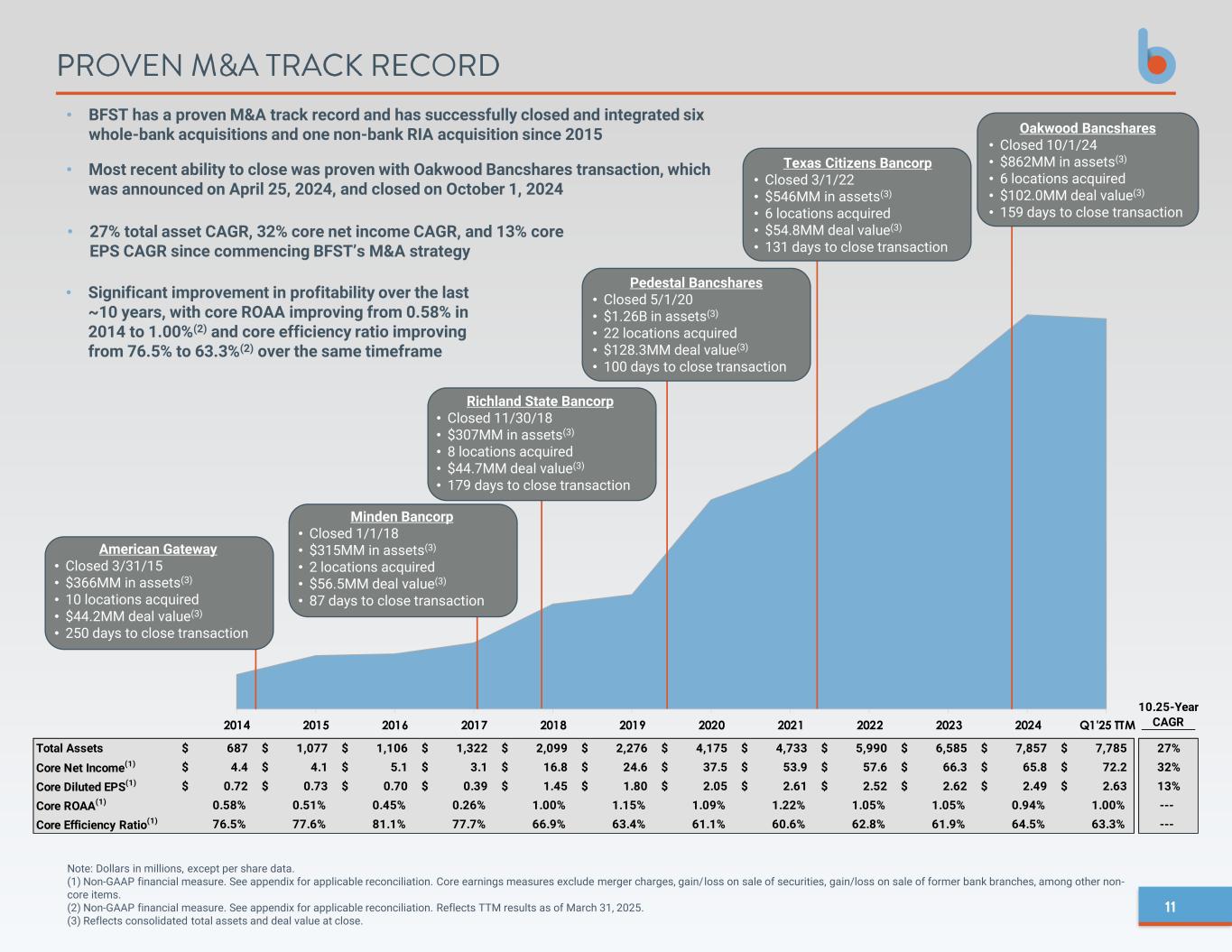 10.25年复合年增长率总资产687美元1,077美元1,106美元1,322美元2,099美元2,276美元4,175美元4,733美元5,990美元6,585美元7,857美元7,785美元27%核心净收入(1)4.4美元4.1美元5.1美元3.1美元16.8美元24.6美元37.5美元53.9美元57.6美元66.3美元65.8美元72.2美元32%核心稀释每股收益(1)0.72美元0.73美元0.70美元0.39美元1.45美元1.80美元2.05美元2.61美元2.52美元2.62美元2.49美元2.49美元2.63美元13%核心ROAA(1)0.58% 0.51% 0.45% 0.26% 1.00% 1.15% 1.09% 1.22% 1.05% 1.05% 0.94% 1.00%---核心效率比(1)76.5% 77.6% 81.1% 77.7% 66.9%546mm美元资产(3)•收购6个地点• 548mm美元交易价值(3)• 131天完成交易注:以百万美元计,每股数据除外。(1)Non-GAAP财务计量。适用的调节见附录。核心收益指标不包括合并费用、出售证券的收益/损失、出售前银行分行的收益/损失,以及其他非核心项目。(2)Non-GAAP财务计量。适用的调节见附录。反映截至2025年3月31日的TTM业绩。(3)反映合并后的总资产和收盘时的交易价值。American Gateway •关闭3/31/15 • 366mm的资产(3)•收购10个地点• 44.2mm美元的交易价值(3)• 250天完成交易Minden Bancorp •关闭1/1/18 • 315mm美元的资产(3)•收购2个地点• 56.5mm美元的交易价值(3)• 87天完成交易Richland 长岛州立银行 • 2018年11月30日关闭• 307mm美元的资产(3)•收购8个地点• 44.7mm美元的交易价值(3)• 179天完成交易Pedestal Bancshares •完成5/1/20 • 1.26B美元的资产(3)•收购22个地点• 128.3mm美元的交易价值(3)• 100天完成交易• BFST已证实并购往绩记录,自2015年以来已成功完成和整合了六项全行收购和一项非银行RIA收购•最近的完成能力已通过Oakwood Bancshares交易得到证明,该交易于2024年4月25日宣布,并于2024年10月1日结束•自开始实施BFST的并购战略以来,总资产CAGR为27%,核心净收入CAGR为32%,核心EPS CAGR为13% •过去~10年盈利能力显着改善,同期核心ROAA从2014年的0.58%提高到1.00%(2),核心效率比率从76.5%提高到63.3%(2)Oakwood Bancshares •关闭10/1/24 • 862mm美元资产(3)•收购6个地点• 102.0mm美元交易价值(3)• 159天完成交易