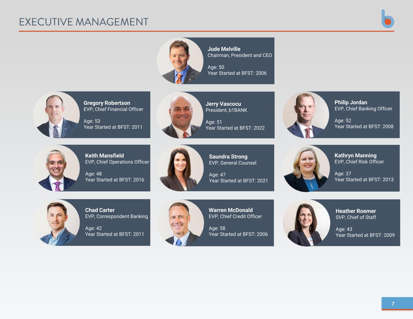 Jude Melville董事长、总裁兼首席执行官年龄:50岁BFST入职:2006年Philip Jordan执行副总裁、首席银行官年龄:52年BFST入职:2008年Keith Mansfield执行副总裁、首席运营官年龄:48年BFST入职:2016年Chad Carter执行副总裁、通讯员银行业务年龄:42年BFST入职:2011年Gregory Robertson执行副总裁、首席财务官首席财务官年龄:53年BFST入职:2011年Heather Roemer高级副总裁、参谋长年龄:43年BFST入职:2009年Saundra Strong执行副总裁、总法律顾问年龄:47年BFST入职首席风险官年龄:37年始于BFST:2013年Warren McDonald执行副总裁、首席信贷官年龄:58岁始于BFST:2006年Jerry Vascocu总裁、b1bANK年龄:51岁始于BFST:2022