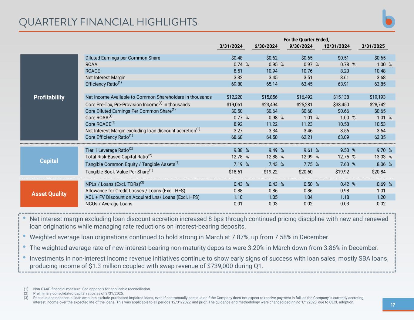 (1)Non-GAAP财务指标。适用的调节见附录。(2)截至2025年3月31日的初步合并资本比率。(3)逾期和非应计贷款金额不包括购买的减值贷款,即使按合同已逾期或公司预计不会收到全额付款,因为公司目前正在贷款的预期期限内增加利息收入。这适用于12/31/2022及之前的所有期间。由于采用CECL,指南和方法从2023年1月1日开始发生变化。•不包括贷款贴现增值的净息差增加了8个基点,这是通过持续的定价纪律与新的和续发的贷款发放,同时管理有息存款的利率下调。• 3月加权平均贷款发放继续保持强劲,为7.87%,高于12月的7.58%。• 3月新增计息未到期存款加权平均利率为3.20%,低于12月的3.86%。•对非利息收入收入计划的投资继续显示出早期成功的迹象,贷款销售,主要是SBA贷款,产生了130万美元的收入,第一季度的掉期收入为739000美元。3/31/20246/30/20249/30/202412/31/20243/31/2025稀释后每股普通股收益0.48美元0.62美元0.65美元0.51美元0.65美元0.65美元ROAA 0.74% 0.95% 0.97% 0.78% 1.00% ROACE 8.51 10.94 10.768.23 10.48净息差3.32 3.45 3.51 3.61 3.68效率比(1)69.80 65.1463.4563.91 63.85普通股股东可获得的净收入以千美元计12,220美元15,856美元16,492美元15,138美元19,193核心税前,拨备前收入(1)以千美元计$ 19,061 $ 23,494 $ 25,281 $ 33,450 $ 28,742核心摊薄每股普通股盈利(1)$ 0.50 $ 0.64 $ 0.68 $ 0.66 $ 0.65核心ROAA(1)0.77% 0.98% 1.01% 1.00% 1.01%核心ROACE(1)8.92 11.22 11.23 10.58 10.53不含贷款贴现增值的净息差(1)3.27 3.34 3.46 3.56 3.64核心效率比(1)68.68 64.5062.2163.0963.35一级杠杆率(2)9.38% 9.49% 9.61% 9.53% 9.70%总风险资本比(2)12.78% 12.88% 12.99% 12.75% 13.03%有形普通股权益/有形资产(1)7.19% 7.43%% 8.06%每股有形帐面价值(1)$ 18.61 $ 19.22 $ 20.60 $ 19.92 $ 20.84不良贷款/贷款(不包括TDR)(3)0.43% 0.43% 0.50% 0.42% 0.69%信贷损失/贷款备抵(不含HFS)0.88 0.86 0.86 0.98 1.01 ACL + FV对已购LNS/贷款的贴现(不含HFS)1.10 1.05 1.04 1.18 1.20 NCO/平均贷款0.01 0.03 0.02 0.03 0.02本季度末资产质量盈利能力资本,