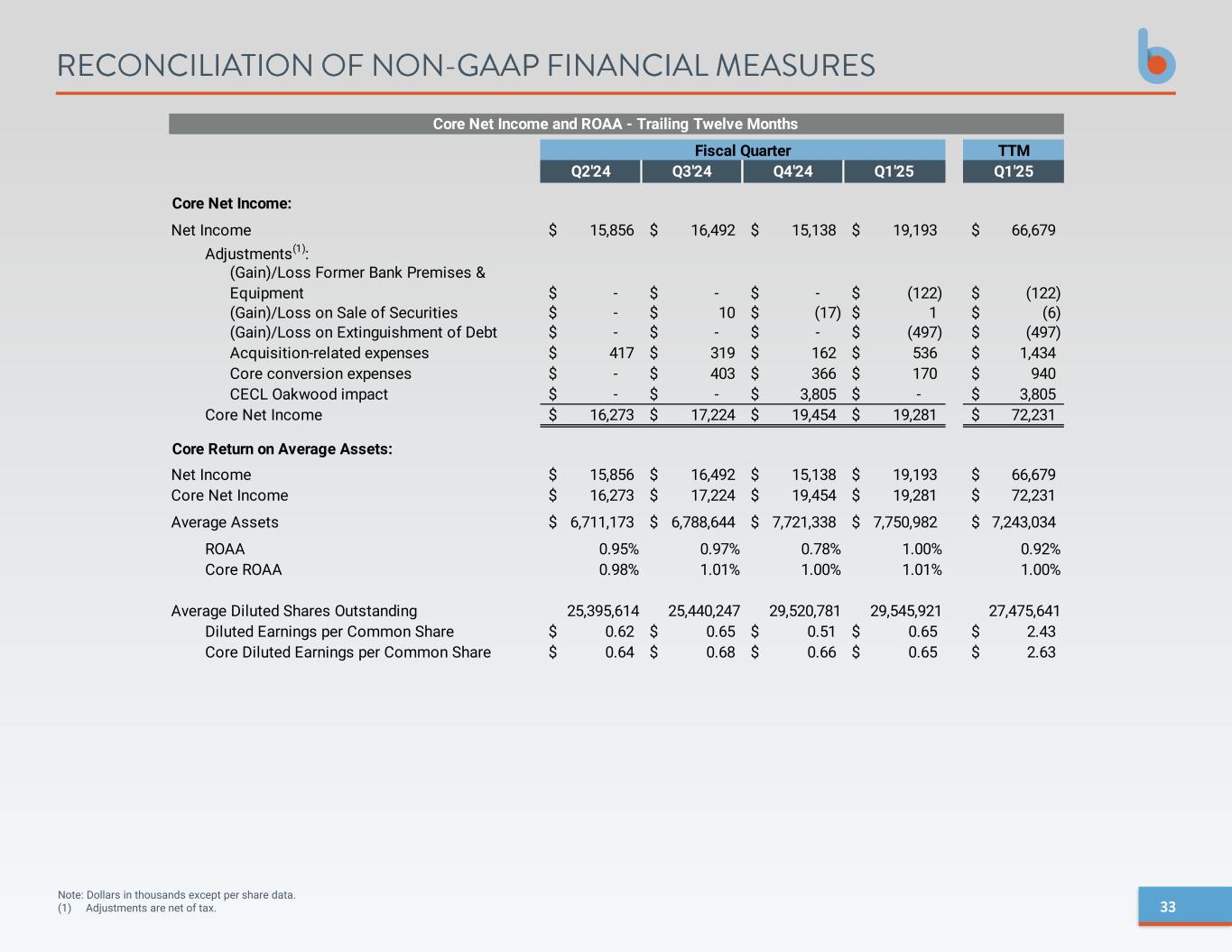 注:除每股数据外,单位为千美元。(1)调整为税后净额。TTM Q2‘24 Q3’24 Q4‘24 Q1’25 Q1 ' 25核心净收入:净收入15,856 $ 16,492 $ 15,138 $ 19,193 $ 66,679 $调整(1):-$-$(122)$(122)$-$ 10 $(17)$ 1 $(6)$-$-$-$(497)$ 417 $ 319 $ 162 $ 536 $ 1,434 $-$ 403 $ 366 $ 170 $ 940 $-$-$ 3,805 $-$ 3,805 $核心净收入16,273 $ 17,224 $ 19,454 $ 19,281 $ 72,231 $核心平均资产回报率:净收入15,856 $ 16,492 $ 15,138 $ 19,193 $ 66,679 $核心净收入16,273 $ 17,224 $ 19,22425,395,61425,440,24729,520,78129,545,92127,475,641稀释每股普通股收益0.62美元0.65美元0.51美元0.65美元2.43美元核心稀释每股普通股收益0.64美元0.68美元0.66美元0.65美元2.63美元核心转换费用CECL Oakwood影响核心净收入和ROAA-过去十二个月的财政季度(收益)/亏损前银行房地和设备(收益)/出售证券损失(收益)/债务收购相关费用的终止损失