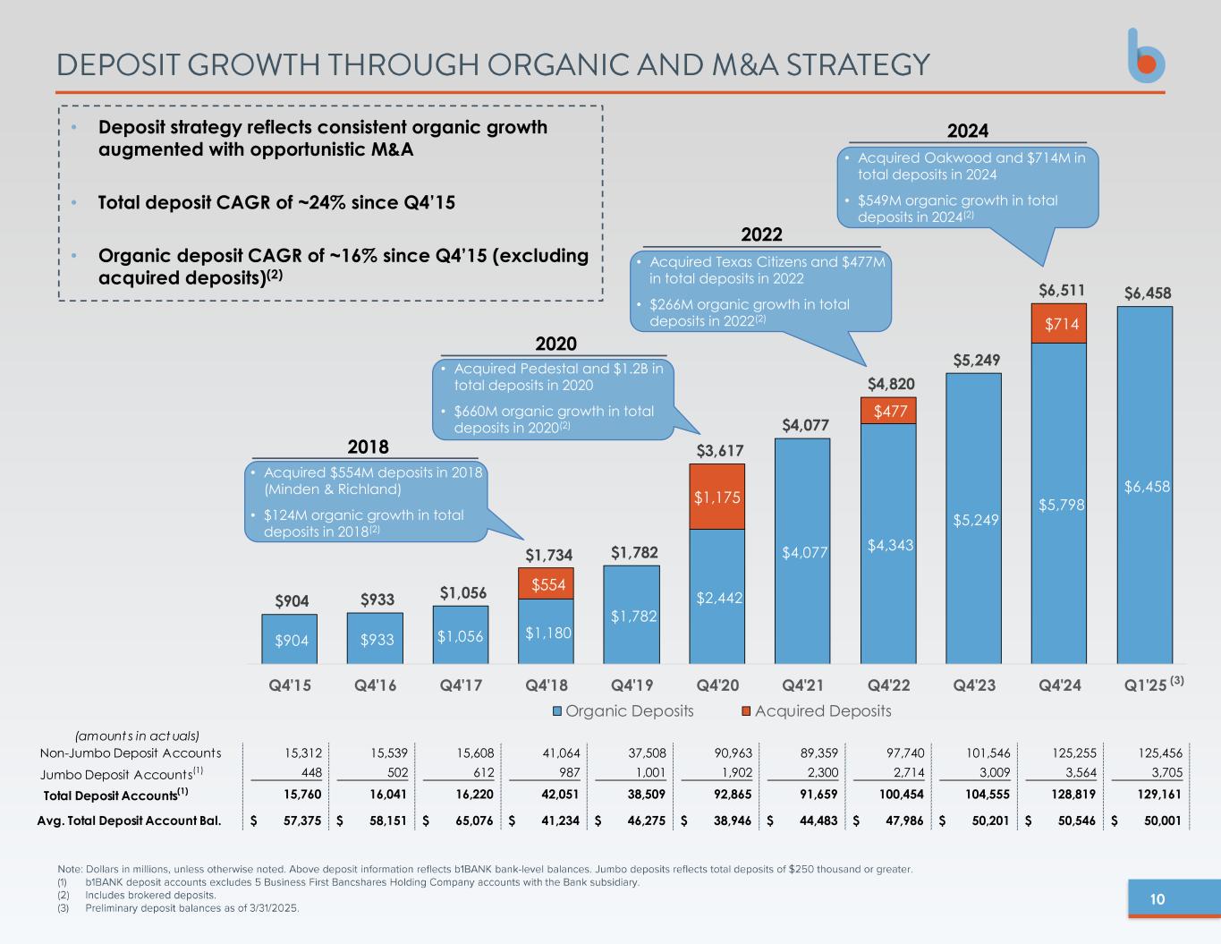 (amount s in act uals)non-jumbo deposit accounts 15,31215,53915,60841,06437,50890,96389,35997,740101,546125,255125,456 jumbo deposit accounts(1)4485026129871,0011,9022,3002,7143,0093,5643,705 total deposit accounts(1)15,76016,04116,22042,05138,50992,86591,659100,454104,555128,819129,161 avg。总存款账户Bal。57,375美元58,151美元65,076美元41,234美元46,275美元38,946美元44,483美元47,986美元50,201美元50,546美元50,001美元904美元933美元1,056美元1,180美元1,782美元2,442美元4,077美元4,343美元5,249美元5,798美元6,458美元554美元1,175美元477美元714美元904美元933美元1,056美元1,734美元1,782美元3,617美元4,077美元4,820美元5,249美元6,511美元6,458 Q4‘15 Q4’16 Q4‘17 Q4’18 Q4‘18 Q4’19 Q4‘20 Q4’21 Q4‘22 Q4’23 Q4‘24 Q1’252022年存款总额4.77亿美元• 2022年存款总额2.66亿美元有机增长(2)2022 • 2020年获得Pedestal和存款总额1.2B美元• 2020年存款总额6.6亿美元有机增长(2)2020 • 2018年获得存款总额5.54亿美元(Minden & Richland)• 2018年存款总额1.24亿美元有机增长(2)2018(3)2024 •收购Oakwood,2024年存款总额7.14亿美元• 2024年存款总额5.49亿美元有机增长(2)