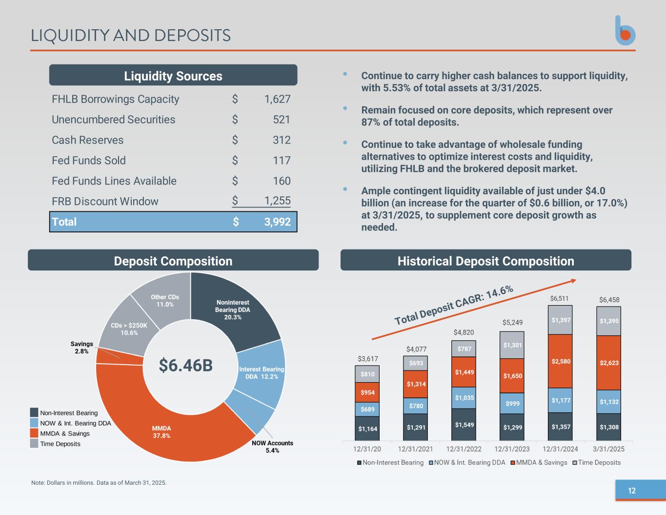 存款构成非计息Now & Int。轴承DDA MMDA &储蓄定期存款•继续携带较高的现金余额以支持流动性,在3/31/2025占总资产的5.53%。•继续专注于核心存款,占总存款的87%以上。•继续利用批发融资替代方案优化利息成本和流动性,利用FHLB和经纪存款市场。•截至2025年3月31日,可用的或有流动性略低于40亿美元(本季度增加了6亿美元,即17.0%),以根据需要补充核心存款增长。$ 6.46B注:百万美元。数据截至2025年3月31日。历史存款构成流动性来源FHLB借款容量1,627 $未设押证券521 $现金储备312 $联邦基金卖出117 $联邦基金额度可用160 $ FRB贴现窗口1,255 $总计3,992 $