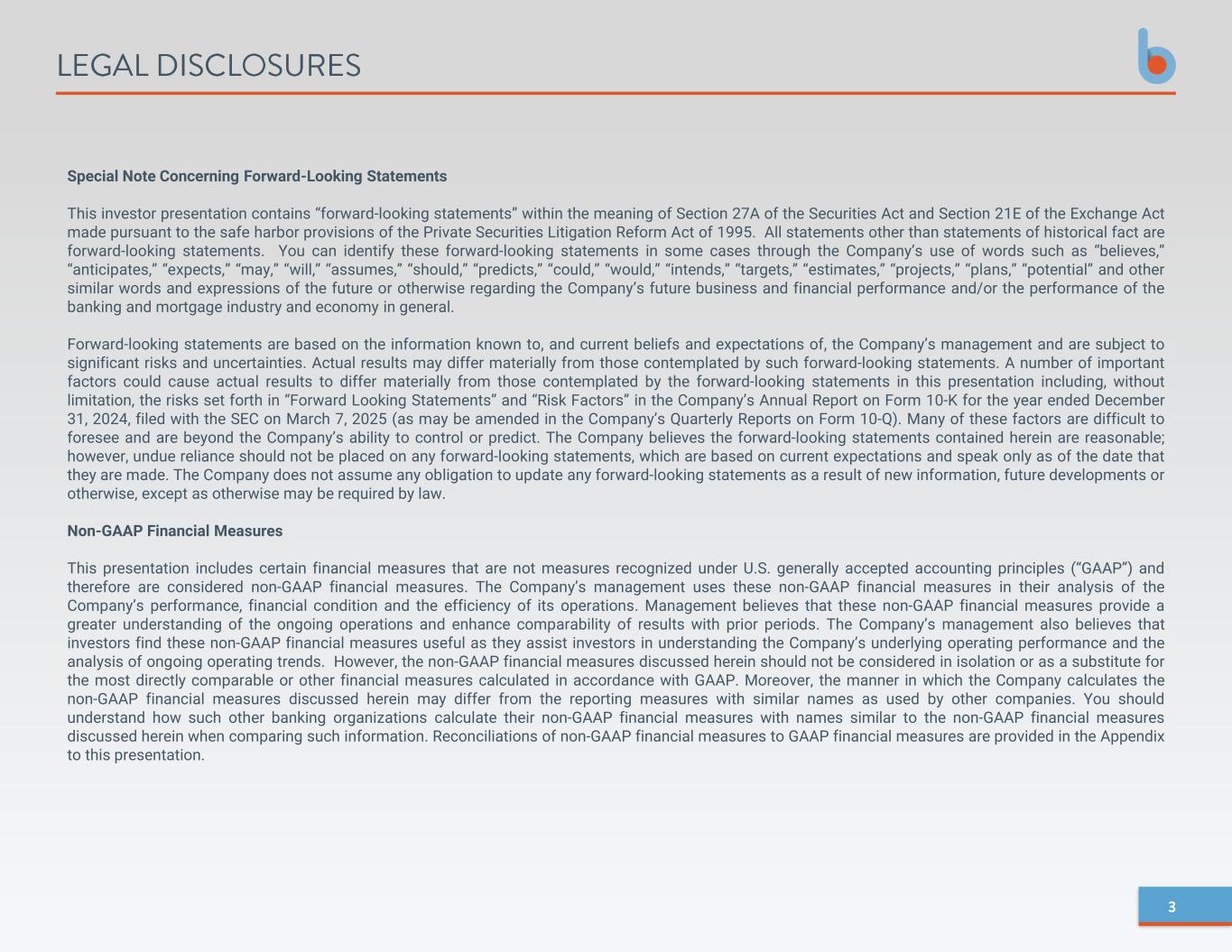 关于前瞻性陈述的特别说明本投资者介绍包含《证券法》第27A条和《交易法》第21E条含义内的“前瞻性陈述”,这些陈述是根据1995年《私人证券诉讼改革法案》的安全港条款作出的。除历史事实陈述外,所有陈述均为前瞻性陈述。在某些情况下,您可以通过公司使用诸如“相信”、“预期”、“预期”、“可能”、“将”、“假设”、“应该”、“预测”、“可能”、“将”、“打算”、“目标”、“估计”、“项目”、“计划”、“潜力”以及其他类似的词语和表达方式来识别这些前瞻性陈述,这些词语和表达方式涉及公司未来的业务和财务业绩以及/或银行业和抵押贷款行业以及整体经济的表现。前瞻性陈述基于公司管理层已知的信息以及当前的信念和预期,并受到重大风险和不确定性的影响。实际结果可能与此类前瞻性陈述所设想的结果存在重大差异。许多重要因素可能导致实际结果与本演示文稿中的前瞻性陈述所设想的结果存在重大差异,包括但不限于公司于2025年3月7日向SEC提交的截至2024年12月31日止年度的10-K表格年度报告中“前瞻性陈述”和“风险因素”中所述的风险(可能会在公司的10-Q表格季度报告中进行修订)。其中许多因素难以预见,超出了公司的控制或预测能力。该公司认为,此处包含的前瞻性陈述是合理的;但是,不应过分依赖任何前瞻性陈述,这些陈述基于当前的预期,并且仅在做出这些陈述之日发表。公司不承担因新信息、未来发展或其他原因而更新任何前瞻性陈述的任何义务,除非法律另有要求。非GAAP财务指标本演示文稿包含某些财务指标,这些指标不是美国公认会计原则(“GAAP”)认可的指标,因此被视为非GAAP财务指标。公司管理层在分析公司业绩、财务状况和运营效率时使用了这些非公认会计准则财务指标。管理层认为,这些非公认会计准则财务指标提供了对持续运营的更深入了解,并增强了业绩与前期的可比性。该公司管理层还认为,投资者认为这些非公认会计准则财务指标很有用,因为它们有助于投资者了解公司的基本经营业绩和对持续经营趋势的分析。然而,本文讨论的非GAAP财务指标不应被孤立地考虑或作为最直接可比或根据GAAP计算的其他财务指标的替代品。此外,公司计算此处讨论的非GAAP财务指标的方式可能与其他公司使用的名称相似的报告指标不同。在比较此类信息时,您应该了解此类其他银行组织如何使用与此处讨论的非GAAP财务指标类似的名称计算其非GAAP财务指标。本演示文稿的附录提供了非GAAP财务指标与GAAP财务指标的对账。
