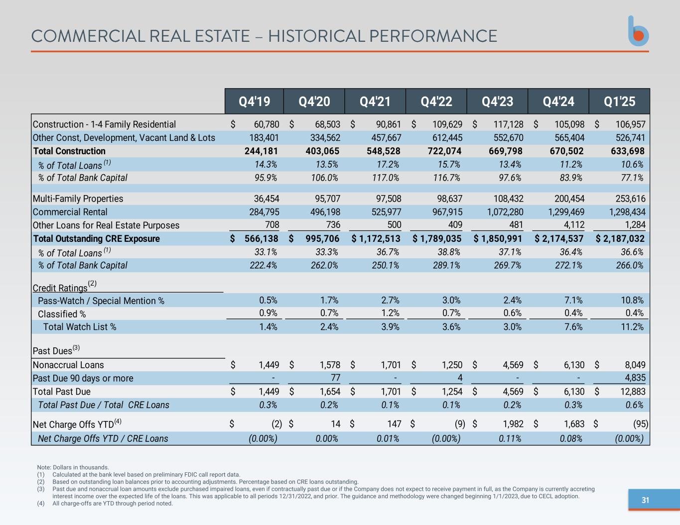 注:单位:千美元。(1)根据初步FDIC呼叫报告数据在银行层面进行计算。(2)基于会计调整前的未偿贷款余额。百分比基于未偿还的CRE贷款。(3)逾期和非应计贷款金额不包括购买的减值贷款,即使按合同约定逾期或公司预计不会收到全额付款,因为公司目前正在贷款的预期期限内增加利息收入。这适用于12/31/2022及之前的所有期间。由于采用了CECL,该指南和方法从2023年1月1日开始发生了变化。(4)所有冲销均为年初至今所述期间。Q4‘19 Q4’20 Q4‘21 Q4’22 Q4‘23 Q4’24 Q1 ' 25 Construction-1-4 Family Residential 60,780 $ 68,503 $ 90,861 $ 109,629 $ 117,128 $ 105,098 $ 106,957 $ Other Const,Development,空置土地及地段183,401334,562457,667612,445552,670565,404526,741总建筑244,181403,065548,528722,074669,798670,502633,698%贷款总额(1)14.3% 13.5% 17.2% 15.7% 13.4% 11.2% 10.6%%银行资本总额95.9% 106.0% 117.0% 116.7% 97.6% 83.9% 77.1%多户物业36,45495,70797,50898,637108,432200,454253,616商业租金284,795496,198525,977967,9151,072,2801,299,4691,298,434其他贷款房地产用途7087365004094814,1121,284未偿CRE风险敞口总额566,138美元995,706美元1,172,513美元1,789,035美元1,850,991美元2,174,537美元2,187,032美元占贷款总额的百分比(1)33.1% 33.3% 36.7% 38.8% 37.1% 36.4% 36.6%占银行总资本的百分比222.4% 262.0% 250.1% 289.1% 269.7% 272.1% 266.0%信用评级(2)Pass-Watch/Special mention % 0.5% 1.7% 2.7% 3.0% 2.4% 7.1% 10.8% Classified % 0.9% 0.7% 1.2% 0.7% 0.6% 0.4% 0.4%总观察名单% 1.4% 2.4% 3.9% 3.6% 3.0% 7.6% 11.2% Past due(3)Non-account loans 1,449 $ 1,578更多-77-4--4,835逾期总额1,449美元1,654美元1,701美元1,254美元4,569美元6,130美元12,883美元逾期总额/CRE贷款总额0.3% 0.2% 0.1% 0.2% 0.3% 0.6%年初至今净冲销(4)(2)$ 14 $ 147 $(9)$ 1,982 $ 1,683 $(95)$年初至今净冲销/CRE贷款(0.00)0.00 0.01%(0.00)0.11% 0.08%(0.00)