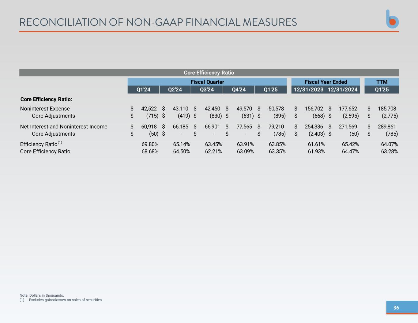 注:单位:千美元。(1)不包括出售证券的收益/损失。TTM Q1‘24 Q2’24 Q3‘24 Q4’24 Q1‘25 12/31/202312/31/2024 Q1’25核心效率比:非利息费用42,522 $ 43,110 $ 42,450 $ 49,570 $ 50,578 $ 156,702 $ 177,652 $ 185,708 $核心调整(715)$(419)$(830)$(631)$(895)$(668)$(2,595)$(2,775)$净利息和非利息收入60,918 $ 66,185 $ 66,901 $ 77,565 $ 79,210 $ 254,336 $ 271,569 $ 289,861 $核心调整(50)$-$-$-$(785)$(2,403)$(50)$