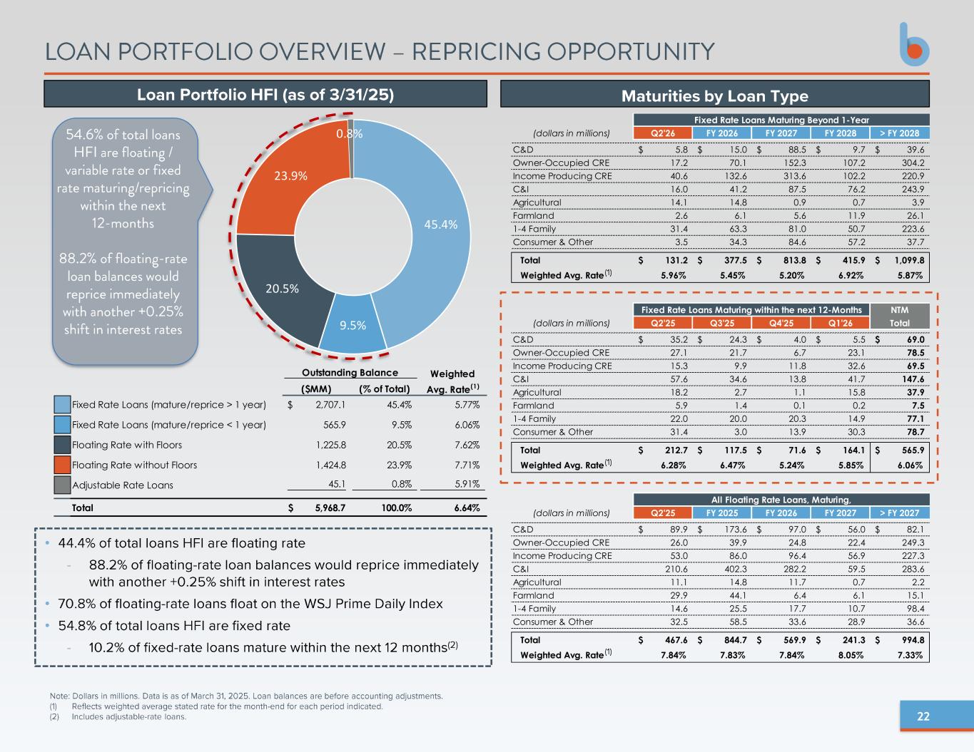 •• •未偿余额加权(百万美元)(占总额的百分比)平均利率(1)固定利率贷款(到期/重新定价> 1年)2,707.1 $ 45.4% 5.77%固定利率贷款(到期/重新定价< 1年)565.9 9.5% 6.06%浮动利率带下限1,225.82 0.5% 7.62%浮动利率无楼层1,424.82 3.9% 7.71%可调整利率贷款45.1 0.8% 5.91%总计5,968.7 $ 100.0% 6.64% 45.4% 9.5% 20.5% 23.9% 0.8% 1年期以上到期的固定利率贷款(百万美元)Q2 ' 26 FY 2026 FY 2027 FY 2028 > FY 2028 C & D 5.8 $ 15.0 $ 88.5 $ 9.7 $ 39.6 $自住CRE 17.27 0.11 52.3 107.2304.2创收CRE 40.61 32.63 13.6 102.22 20.9 C & I 16.04 1.287.5 76.2243.9农业14.11 4.8 0.9 0.7 3.9农田2.66.15.6 11.9 26.1 1-4家庭31.46 3.38 1.05 0.72 23.6消费者及其他3.53 4.384.65 7.237.7总计131.2 $ 377.5 $ 813.8 $ 42.42 20.9 C & I 16.04 1.287.5 76.22平均。利率5.96% 5.45% 5.20% 6.92% 5.87%未来12个月内到期的固定利率贷款NTM(百万美元)Q2‘25 Q3’25 Q4‘25 Q1’26总计C & D 35.2 $ 24.3 $ 4.0 $ 5.5 $ 69.0 $自住CRE 27.12 1.76.72 3.17 8.5 Income Producing CRE 15.39.91 1.83 2.66 9.5 C & I 57.63 4.61 3.84 1.71 47.6 Agricultural 18.2 2.7 1.115.8 37.9 Farmland 5.9 1.4 0.10.27.5 1-4 Family 22.02 0.02 0.31 4.97 7.1 Consumer & Other 31.4 3.01 3.93 0.378.7 Total 212.7 $ 117.5 $ 71.6 $ 164.1 $ 565.9 $ Weighted Avg。利率6.28% 6.47% 5.24% 5.85% 6.06%所有浮动利率贷款,到期,(百万美元)Q2 ' 25 FY 2025 FY 2026 FY 2027 > FY 2027 C & D 89.9 $ 173.6 $ 97.0 $ 56.0 $ 82.1 $自住CRE 26.03 9.9 24.82 2.4249.3收入产生CRE 53.086.0 96.456.92 27.3 C & I 210.6402.328 2.259.5283.6农业11.11 4.81 1.7 0.7 2.2农田29.94 4.16.46.1 15.1 1-4家庭14.6 25.5 17.7 10.7 98.4消费者及其他32.558.53 3.628.9 36.6总计467.6 $ 844.7 $ 569.9 $ 241.3 $ 994.8 $加权平均。率7.84% 7.83% 7.84% 8.05% 7.33%