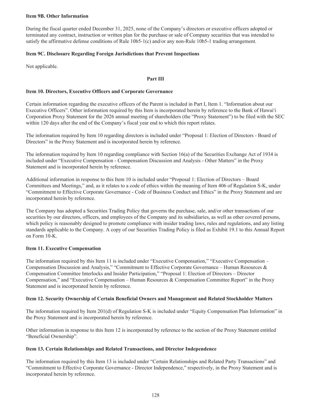 项目9b。其他信息在截至2025年12月31日的财政季度,公司董事或执行官均未采纳或终止任何旨在满足规则10b5-1(c)和/或任何非规则10b5-1交易安排的肯定抗辩条件的购买或出售公司证券的合同、指示或书面计划。项目9c。关于阻止检查的外国司法管辖区的披露不适用。第三部分第10项。董事、执行官和公司治理有关母公司执行官的某些信息包含在第一部分第1项中。“关于我们执行官的信息”。本项目要求的其他信息通过引用夏威夷银行公司2026年年度股东大会的代理声明(“代理声明”)并入本文,该声明将在本报告所涉及的公司财政年度结束后120天内提交给SEC。第10项要求的有关董事的信息包含在代理声明的“提案1:选举董事-董事会”下,并以引用方式并入本文。第10项要求的有关遵守1934年《证券交易法》第16(a)节的信息包含在代理声明的“高管薪酬-薪酬讨论和分析-其他事项”下,并以引用方式并入本文。针对本项目10的补充信息包含在“提案1:选举董事——董事会委员会和会议”项下,由于涉及S-K条例第406项含义内的道德准则,因此包含在代理声明的“对有效公司治理的承诺——商业行为和道德准则”项下,并以引用方式并入本文。公司已采纳证券交易政策,以规管公司及其附属公司的董事、高级职员、雇员以及其他受覆盖人士购买、出售和/或其他交易我们的证券,该政策是合理设计的,旨在促进遵守内幕交易法律、规则和条例以及适用于公司的任何上市标准。我们的证券交易政策副本作为本年度报告的附件 19.1在表格10-K中提交。第11项。高管薪酬第11项要求的信息包含在代理声明中的“高管薪酬”、“高管薪酬–薪酬讨论与分析”、“对有效公司治理的承诺–人力资源与薪酬委员会的联锁和内部人参与”、“提案1:选举董事–董事薪酬”和“高管薪酬–人力资源与薪酬委员会报告”项下,并以引用方式并入本文。项目12。某些受益所有人的证券所有权和管理层及相关股东事项S-K条例第201(d)项要求的信息包含在代理声明的“股权补偿计划信息”下,并以引用方式并入本文。针对本项目12的其他信息通过引用并入代理声明中题为“实益所有权”的部分。项目13。某些关系和关联交易、董事独立性本项目13要求的信息分别包含在代理声明的“某些关系和关联方交易”和“对有效公司治理的承诺-董事独立性”项下,并以引用方式并入本文。128