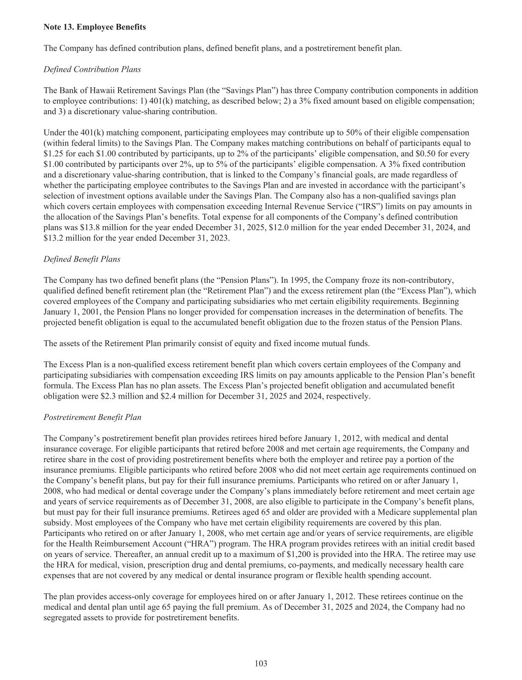 注13。员工福利本公司设有固定缴款计划、固定福利计划、退休后福利计划。确定供款计划夏威夷银行退休储蓄计划(“储蓄计划”)除了员工供款外,还有三个公司供款部分:1)401(k)匹配,如下所述;2)根据合格薪酬确定3%的固定金额;以及3)酌情进行价值分享供款。根据401(k)匹配部分,参与的员工最多可向储蓄计划贡献其合格薪酬的50%(在联邦限额内)。该公司代表参与者提供的匹配捐款相当于参与者每贡献1.00美元的1.25美元,最高可达参与者合格补偿的2%,参与者每贡献超过2%的1.00美元可获得0.50美元,最高可达参与者合格补偿的5%。与公司财务目标挂钩的3%固定供款和可自由支配的价值分享供款,无论参与员工是否为储蓄计划供款,均根据参与者选择的储蓄计划下可用的投资方案进行投资。该公司还有一项不合格的储蓄计划,在储蓄计划的福利分配中,该计划涵盖了薪酬超过美国国税局(“IRS”)工资金额限制的某些员工。截至2025年12月31日止年度,公司固定缴款计划所有组成部分的总费用为1380万美元,截至2024年12月31日止年度为1200万美元,截至2023年12月31日止年度为1320万美元。设定受益计划本公司有两个设定受益计划(“养老金计划”)。1995年,公司冻结了其非缴费型、合格的固定福利退休计划(“退休计划”)和超额退休计划(“超额计划”),该计划覆盖了公司和参与子公司符合一定资格要求的员工。自2001年1月1日起,养老金计划在确定福利方面不再规定补偿增加。预计福利义务等于因养老金计划被冻结状态而产生的累计福利义务。退休计划的资产主要包括股票和固定收益共同基金。超额计划是一项不合格的超额退休福利计划,涵盖公司及参与子公司的某些员工,其薪酬超过适用于养老金计划福利公式的薪酬金额的IRS限制。超额计划没有计划资产。2025年12月31日和2024年12月31日,超额计划的预计福利义务和累计福利义务分别为230万美元和240万美元。退休后福利计划公司的退休后福利计划为2012年1月1日前聘用的退休人员提供医疗和牙科保险。对于在2008年之前退休并满足一定年龄要求的符合条件的参与者,公司和退休人员在雇主和退休人员都支付一部分保险费的情况下分担提供退休后福利的费用。不符合特定年龄要求的2008年前退休的合格参与者继续参加公司的福利计划,但支付其全额保险费。于2008年1月1日或之后退休的参与者,在紧接退休前已根据公司计划享有医疗或牙科保险,并于2008年12月31日满足特定年龄和服务年限要求,也有资格参加公司的福利计划,但必须支付其全部保险费。为65岁及以上退休人员提供医疗保险补充计划补贴。本公司大部分符合特定资格要求的员工均在本计划范围内。在2008年1月1日或之后退休的参与者,符合特定年龄和/或服务年限的要求,有资格参加健康报销账户(“HRA”)计划。HRA计划根据服务年限为退休人员提供初始信用。此后,每年向HRA提供最高1200美元的信用额度。退休人员可将HRA用于任何医疗或牙科保险计划或灵活的健康支出账户未涵盖的医疗、视力、处方药和牙科保险费、共同付款以及医疗必需的医疗保健费用。该计划为2012年1月1日或之后聘用的员工提供仅准入保险。这些退休人员继续享受医疗和牙科计划,直到65岁支付全部保费。截至2025年12月31日和2024年12月31日,公司没有为退休后福利提供拨备的分离资产。103