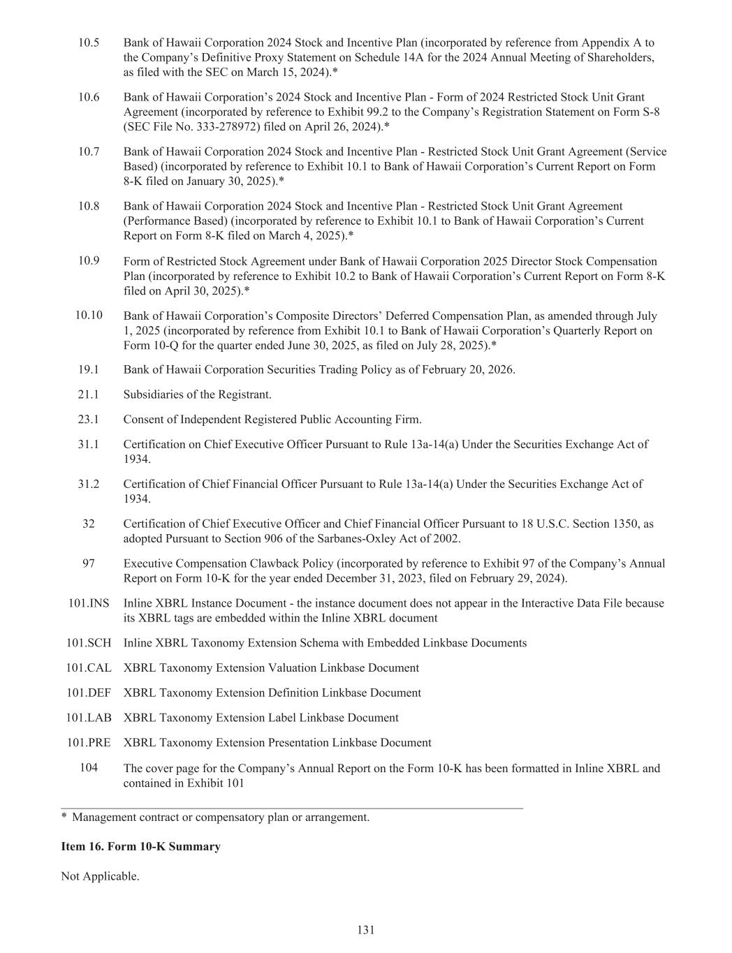 10.5 夏威夷银行公司2024年股票和激励计划(通过引用并入公司于2024年3月15日向SEC提交的关于2024年年度股东大会的附表14A的最终委托书的附录A)。*10.6 夏威夷银行公司的2024年股票和激励计划-2024年限制性股票授予协议表格(通过引用附件 99.2并入公司于4月26日提交的表格S-8上的注册声明(SEC文件编号:333-278972),2024).*10.7 夏威夷银行公司2024年股票和激励计划-限制性股票授予协议(基于服务)(通过引用夏威夷银行公司于2025年1月30日提交的表格8-K的当前报告中的附件 ↓ 10.1并入)。*10.8 夏威夷银行公司2024年股票和激励计划-限制性股票授予协议(基于业绩)(通过引用夏威夷银行公司于3月4日提交的表格8-K的当前报告中的附件 10.1纳入,2025).*10.9根据夏威夷银行公司2025年董事股票薪酬计划签订的限制性股票协议表格(通过引用附件 10.2并入夏威夷银行公司于2025年4月30日提交的关于表格8-K的当前报告)。*10.10经修订至2025年7月1日的夏威夷银行公司综合董事递延薪酬计划(以引用方式从附件 10.1并入夏威夷银行公司于2025年7月28日提交的截至2025年6月30日的季度的10-Q表格季度报告)。*19.1截至2026年2月20日的夏威夷银行公司证券交易政策。21.1注册人的附属公司。23.1独立注册会计师事务所同意。31.1根据1934年《证券交易法》第13a-14(a)条对首席执行官进行认证。31.2根据1934年《证券交易法》规则13a-14(a)对首席财务官进行认证。32根据18 U.S.C.第1350条对首席执行官和首席财务官进行认证,该认证是根据2002年《萨班斯-奥克斯利法案》第906条通过的。97高管薪酬追回政策(通过参考公司于2024年2月29日提交的截至2023年12月31日止年度的10-K表格年度报告的附件 97纳入)。101.INS内联XBRL实例文档-实例文档不会出现在交互式数据文件中,因为其XBRL标记嵌入到内联XBRL文档101.SCH内联XBRL分类扩展架构中,其中包含嵌入式linkbase文档101.CAL XBRL分类扩展估值linkbase文档101.DEF XBRL分类扩展定义linkbase文档101.LAB XBRL分类扩展标签linkbase document 101.PRE XBRL Taxonomy Extension Presentation linkbase document 104公司10-K表格年度报告的封面页已采用内联XBRL格式,并包含在附件 101________________________________________________________________________________________________________________________________________*管理合同或补偿性计划或安排。项目16。表格10-K摘要不适用。131
