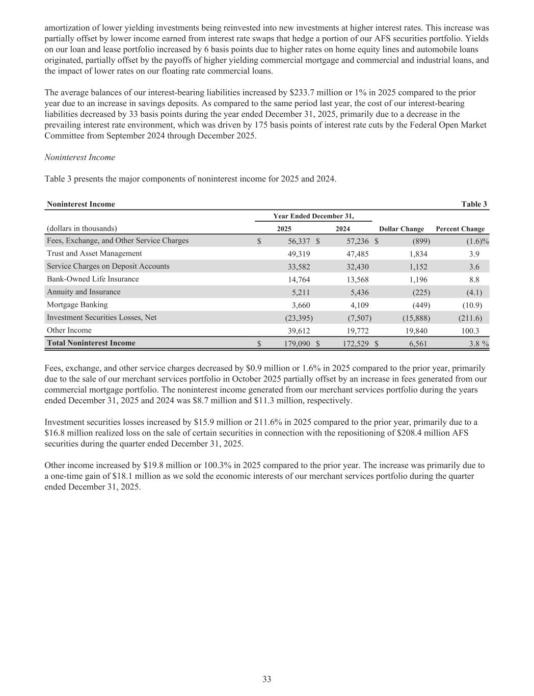 以较高利率再投资于新投资的较低收益投资的摊销。这一增长被对冲我们一部分AFS证券投资组合的利率掉期赚取的较低收入部分抵消。我们的贷款和租赁组合的收益率增加了6个基点,原因是房屋净值额度和汽车贷款的利率上升,部分被更高收益率的商业抵押贷款和商业和工业贷款的回报以及较低利率对我们的浮动利率商业贷款的影响所抵消。由于储蓄存款增加,我们的计息负债的平均余额在2025年比上一年增加了2.337亿美元或1%。与去年同期相比,截至2025年12月31日止年度,我们的计息负债成本下降了33个基点,这主要是由于当前利率环境下降,这是由联邦公开市场委员会在2024年9月至2025年12月期间降息175个基点推动的。非利息收入表3列出了2025年和2024年非利息收入的主要组成部分。非利息收入表截至12月31日的3年,(单位:千美元)20252024年美元变动百分比变动费、兑换费和其他服务费$ 56,337 $ 57,236 $(899)(1.6)%信托和资产管理49,31947,4851,8343.9存款账户服务费33,58232,4301,1523.6银行拥有的人寿保险14,76413,5681,1968.8年金和保险5,2115,436(225)(4.1)抵押银行业务3,6604,109(449)(10.9)投资证券损失,净额(23,395)(7,507)(15,888)(211.6)其他收入39,61219,77219,840100.3非利息收入总额179,090美元172,529美元6,5613.8%费用、汇兑与上一年相比,2025年其他服务费用减少了0.9百万美元或1.6%,这主要是由于2025年10月出售了我们的商户服务组合,部分被我们的商业抵押贷款组合产生的费用增加所抵消。截至2025年12月31日和2024年12月31日止年度,我们的商户服务组合产生的非利息收入分别为870万美元和1130万美元。与上一年相比,2025年投资证券损失增加了1590万美元或211.6%,主要是由于在截至2025年12月31日的季度中,与重新定位2.084亿美元的AFS证券有关的某些证券的销售实现了1680万美元的损失。其他收入在2025年比上一年增加了1980万美元或100.3%。这一增长主要是由于我们在截至2025年12月31日的季度出售了商户服务组合的经济权益,从而获得了1810万美元的一次性收益。33