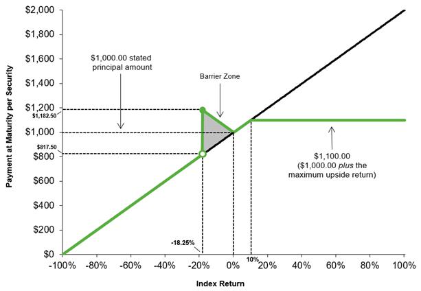 | ▪ | 证券在到期时根据标的指数从初始指数水平到最终指数水平的百分比变化的绝对值,在有限的范围内提供正收益的潜力。如果标的指数升值,该证券提供1对1参与该升值,但以下文规定的最大上行收益为准。如果基础指数贬值,该证券提供1对1正向参与该贬值的绝对值,但前提是最终指数水平大于或等于下文规定的障碍水平,即等于初始指数水平的81.75%。为换取即使基础指数贬值也可能在到期时获得正收益,证券投资者必须愿意放弃(i)对基础指数所包含的证券的利息和股票的股息,以及(ii)参与基础指数超过最大上行收益的任何升值。此外,如果基础指数贬值且最终指数水平低于障碍水平,您将面临该贬值的全部负面下行风险,并且最终指数水平低于初始指数水平的每1%将损失您的证券规定本金金额的1%。 |