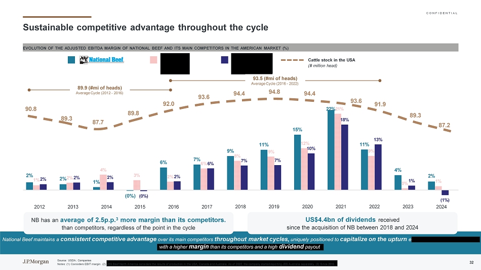 C O N F I D E N T I A L美国牛周期综述美国股市周屠牛数量(USDA)VS预估产能2808590951001051101151.2万头USDA 1月1日报告,202586.7百万-1% 1951年以来最低牛存栏400,000450,000500,000550,000600,0002007200920112013201320152015201720192021202120232025 E 2027 E 2029 E U = 92% U avg~83%周期开始高U = 78% #每周牛出栏数(USDA)行业产能估计牲畜存栏水平遵循周期性周期尽管这一周期性周期已经持续了超过一代人,但每一轮周期的上涨幅度都小于上一轮周期的上涨幅度。这表明美国牛群多年来一直在下降2017年出现的牛群数量峰值导致了2020年饲养场牛数量的峰值-21肉牛数量的下降始于2018年,并且仍在加速,自2023年以来,可供屠宰的牛的供应量减少了来源:美国农业部注:(1)尚未有小牛的年轻母牛;(2)基于每周6天的容量的NBP估计。假设2025年净运力增量变化为350/天,2026年为(4500)/天。31预计未来几年美国的牛周期将发生逆转,届时应该会逐步重建牛群,对该行业公司的利润率产生积极影响