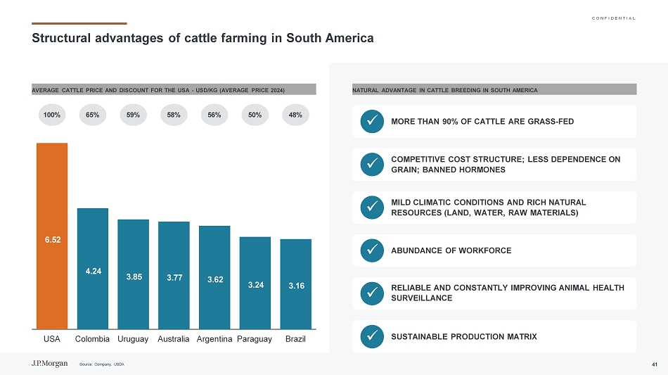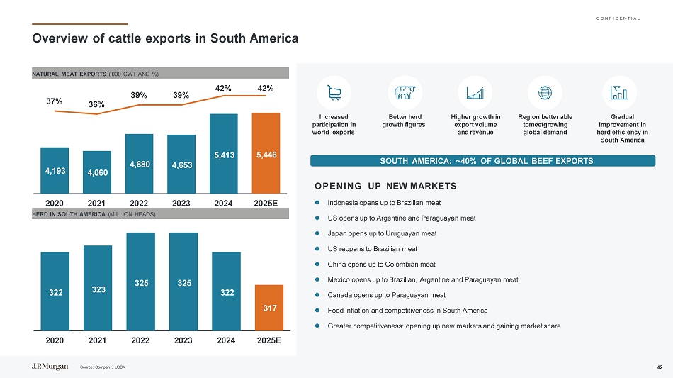 C O N F I D E N T I A L南美养牛的结构优势南美养牛的自然优势6.5 24.24 3.85 3.77 3.62 3.24 3.16美国哥伦比亚乌拉圭澳大利亚阿根廷巴拉圭巴西对美国的平均牛价格和折扣-美元/公斤(2024年平均价格)100% 65% 59% 58% 56% 50% 48% 90%以上的牛是草饲竞争性成本结构;对谷物的依赖较少;被禁止的HOMONES温和的气候条件和丰富的自然资源原材料)丰富的劳动力可靠且不断改善的动物健康监测可持续生产矩阵x x x x x x资料来源:公司、USDA 41