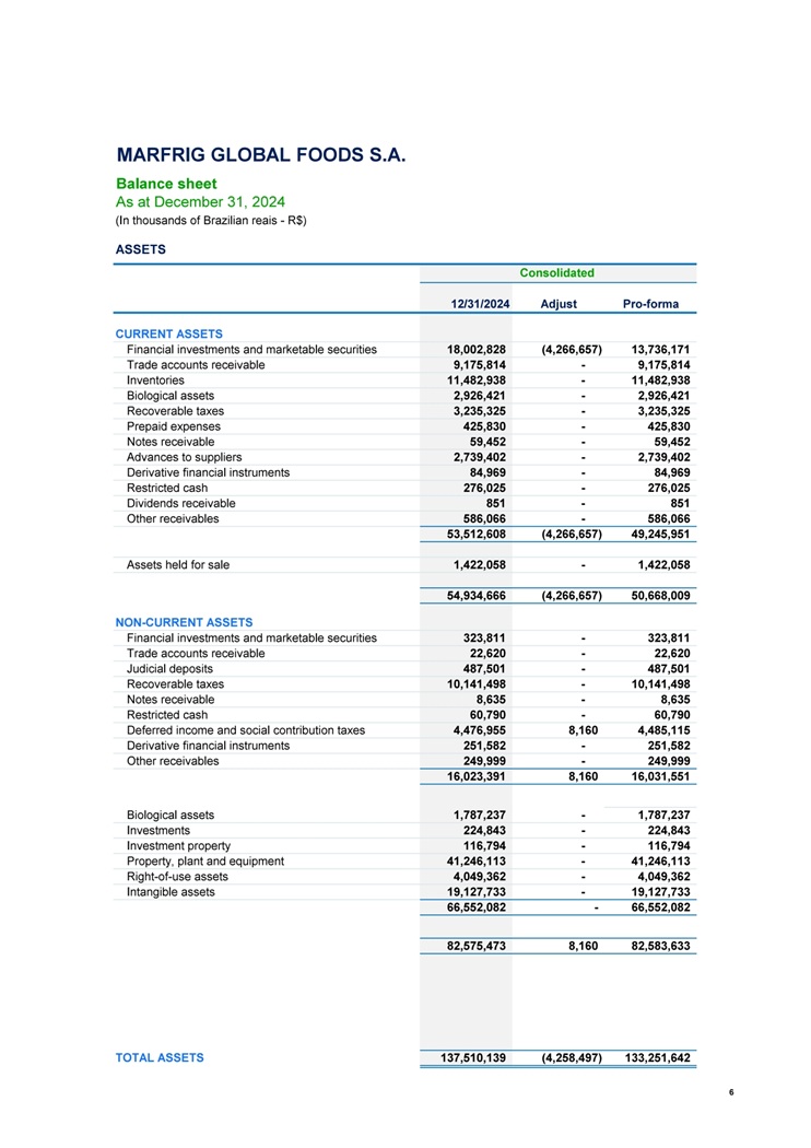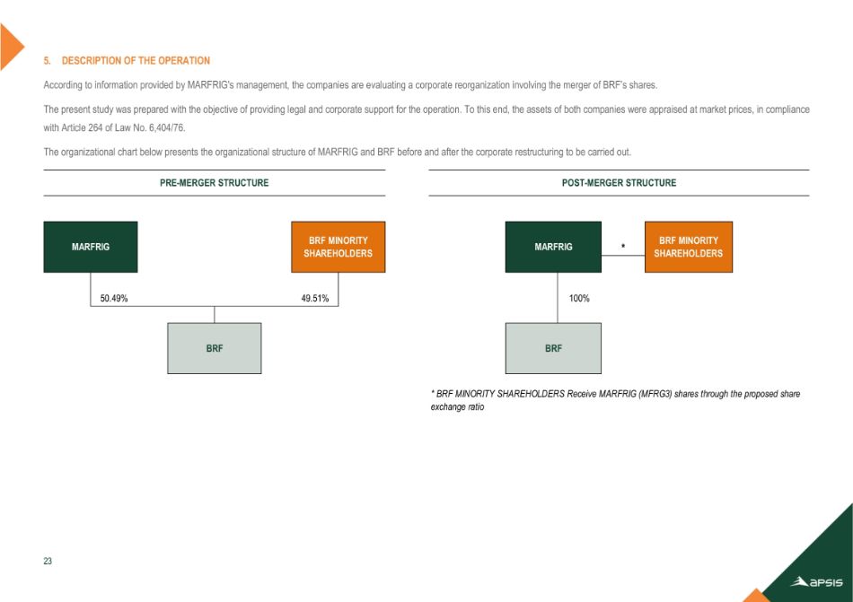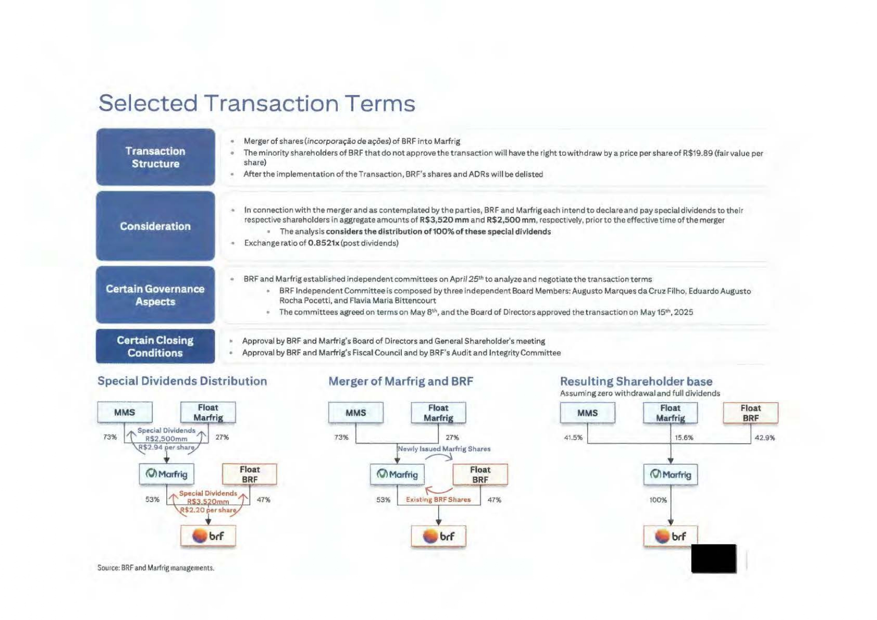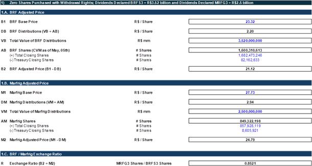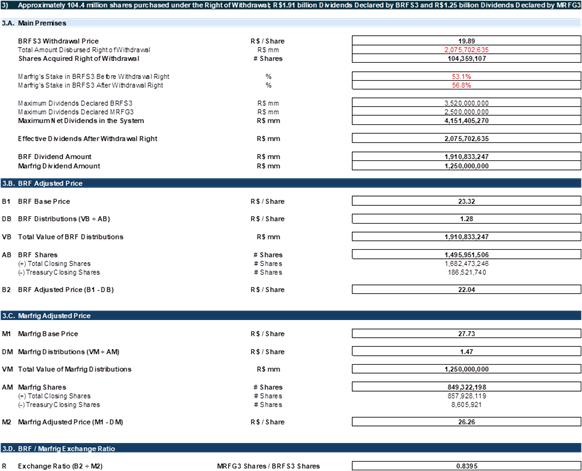 | (一) | 关于“Marfrig Global Foods S.A.合并BRF S.A.股份的计划”的批准,该公司与BRF S.A.(“BRF”),其中确立了将不由Marfrig持有的所有由BRF发行的股份合并的条款和条件(“合并”和“合并计划”,分别); |