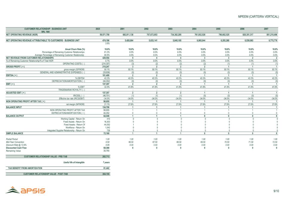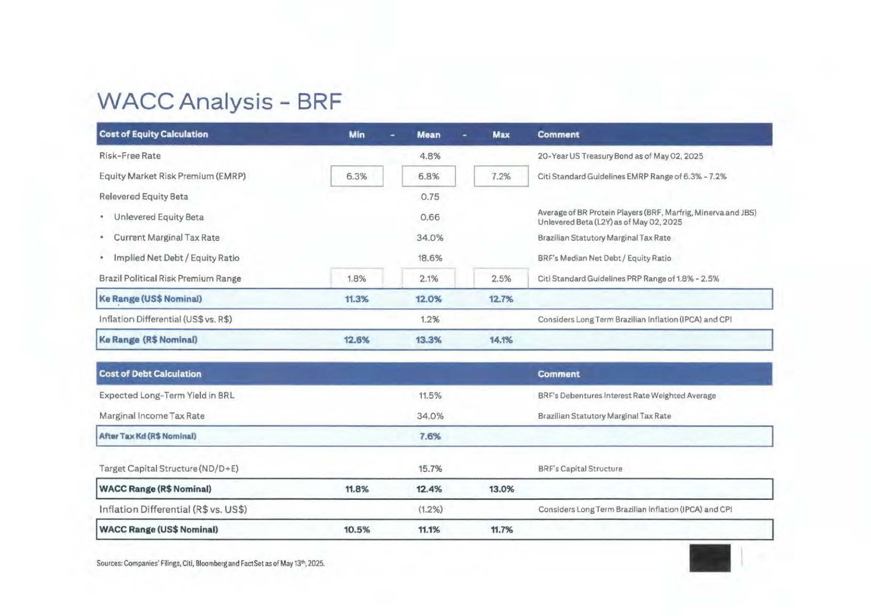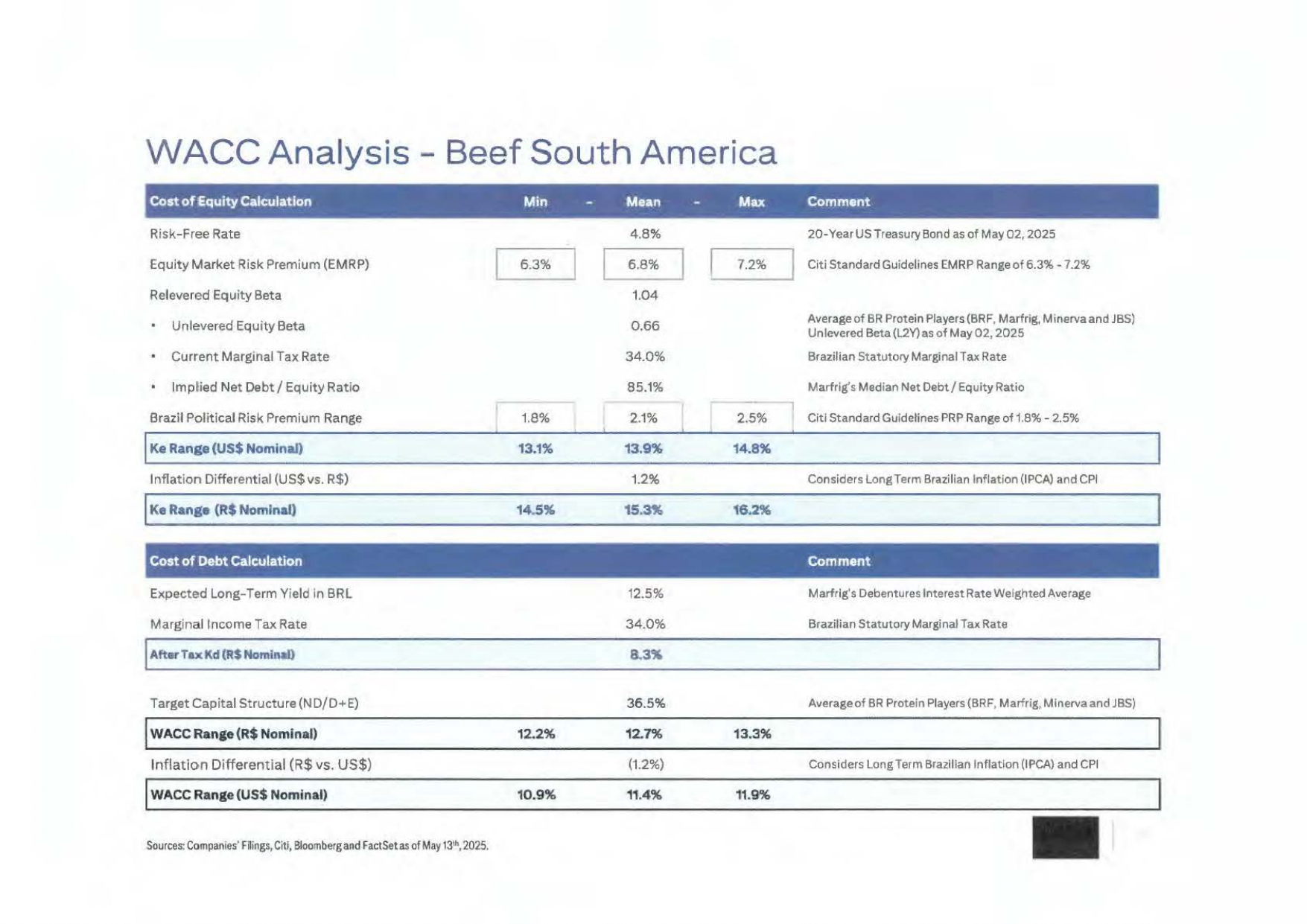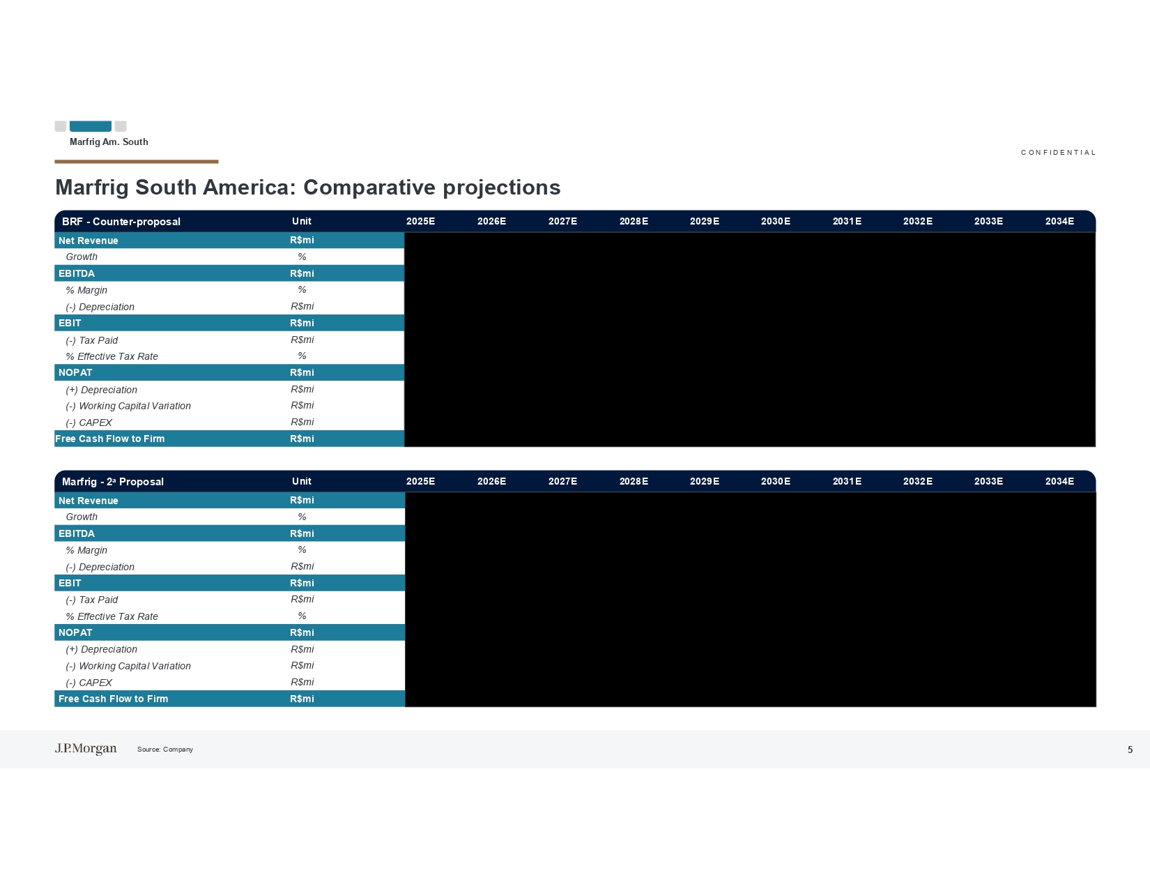 C O N F I D E N T I A L Marfrig North America:比较预测Marfrig North America 2034E 2033E 2032E 2031E 2030E 2029E 2028E 2027E 2026E 2025E单位BRF-反提案101,08297,63794,3109791,09787,99384,99483,73880,06378,23475,968 R $ mi净收入3.5% 3.5% 3.5% 3.5% 1.5% 4.6% 4.6% 2.3% 3.0% 13.5% %增长5,0544,8824,7164,5864,400,2503,5211,120,1231,212 R $ mi EBITDA 5.0% 5.0% 5.0% 5.0% 5.0% 4.2% 1.4% 1.4% 1.6% %%利润率(1,237)(1,088)(944)(805)折旧3,8173,7943,7723,7813,0442,8062,204(74)47252 R $ mi息税前利润(916)(911)(905)(907)(731)(674)(529)18(11)0 R $ mi(-)已缴税24.0% 24.0% 24.0% 24.0% 24.0% 24.0% 24.0% 24.0% 24.0% 0.0% %%有效税率2,9012,8832,8662,8742,3132,1331,675(56)36252 R $ mi NOPAT 1,2371,0889448051,3561,4431,3171,1941,075960 R $ mi(+)折旧(176)(168)(162)(154)(148)(75)(139)(101)(126)(45)CAPEX 2,4462,3382,2332,1582,201,2261,597(164)(188)(387)R $ mi自由现金流至公司2034E 2033E 2032E 2031E 2030E 2029E 2028E 2027E 2026E 2025E单位Marfrig-2 a建议116,758110,998104,999998,35191,67585,03683,95380,40278,36675,968 R $ mi净收入5.2% 5.7% 6.8% 7.3% 7.8% 1.3% 4.4% 2.6% 3.2% 16.0%增长8,93510,8469,6908,5027,4264,9653,5301,1251,1251,212 R $ mi EBITDA 7.7% 9.8% 9.2% 8.6% 8.1% 5.8% 4.2% 1.4% 1.4% 1.6% %% margin(1,302)7,6339,7158,7217,6856,0663,5202,212(70)49252 R $ mi息税前利润(1,832)(2,332)(2,093)(1,844)(1,456)(845)(531)-(12)(61)R $ mi(-)已缴税款24.0% 24.0% 24.0% 24.0% 24.0% 24.0% 24.0% 24.0% 24.0% %有效税率5,8017,3836,6285,8404,6102,6751,681(70)37192 R $ mi NOPAT 1,3021,1319698171,3601,4451,3181,1941,075960 R $ mi(+)折旧(317)(289)(308)(303)(284)(85CAPEX 5,0346,5615,7144,8794,3112,7601,586(226)(305)(447)R $ mi自由现金流到公司来源:公司7