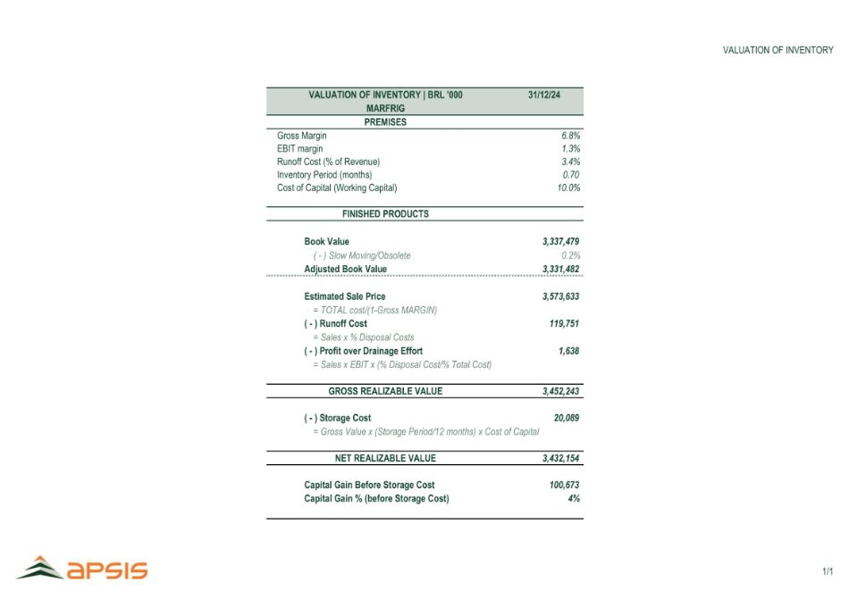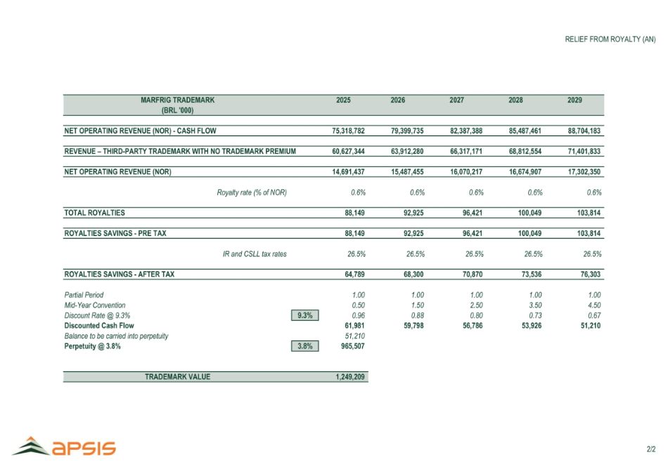 资本支出和营运资本预测Marfrig北美和南美C O N F I D E N T I A L主要假设Marfrig ex-BRF对于北美,它考虑的资本支出为2025年至2034年净营收的0.9%。对于南美,它认为资本支出在2025年占净收入的2.2%,在2026年占净收入的2.0%,从2027年开始正常化为1.9%。对于营运资金,估计考虑了2024年实现的营运资金天数的价值,预测不变,直到2034年资本支出和占总净收入的百分比(R $ MI,%)5216297167387587918018649279891,0461,1001,1799715135435705956376827297758241,7001,6001,1504341,2511,3001,3611,3961,5011,6091,7181,8211,9242.3% 1.9% 1.2% 1.2% 1.2% 1.2% 1.2% 1.2% 1.2% 2023A 2024A 2025E 2030E 2026E 2026E 2027E 2028E 2029E北美南美2031E 2032E 2033E 2034E收入占营运资本(MI雷亚尔)1,2941,4171,4621,5881,6651,8421,9872,1332,2772,340 2025E 2027E 2028E 2029E 2031